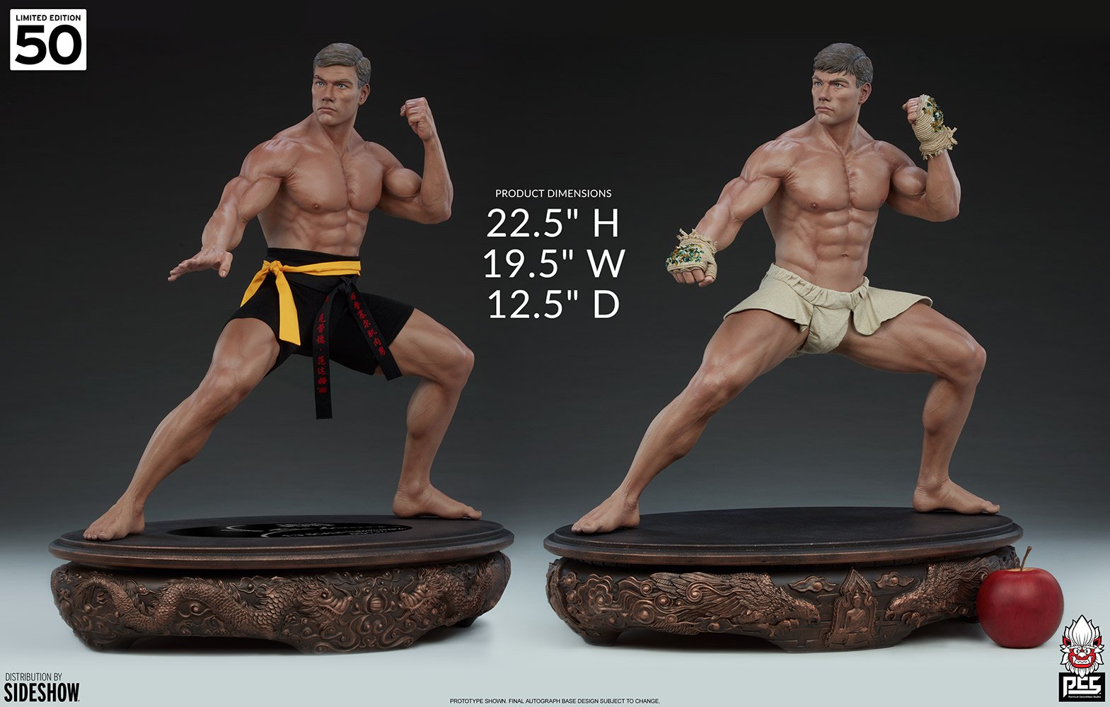 The Shotokan 1:3 Scale Tribute Statue is a mixed media collectible with a fully sculpted physique and a fabric costume complete with black trunks, a yellow sash, and his black belt in honor of his accomplishments. The Muay Thai 1:3 Scale Tribute Statue is a mixed media collectible with a fully sculpted physique, sculpted hand-wraps, and traditional-style beige fabric Muay Thai trunks. In both figural depictions, Van Damme takes a wide, powerful stance on a bronze-painted base detailed with dragons, showcasing his strength and discipline. This collectible statue set is limited to only 50 pieces, making this the ultimate centerpiece for fans of Jean-Claude Van Damme and his legacy in film.