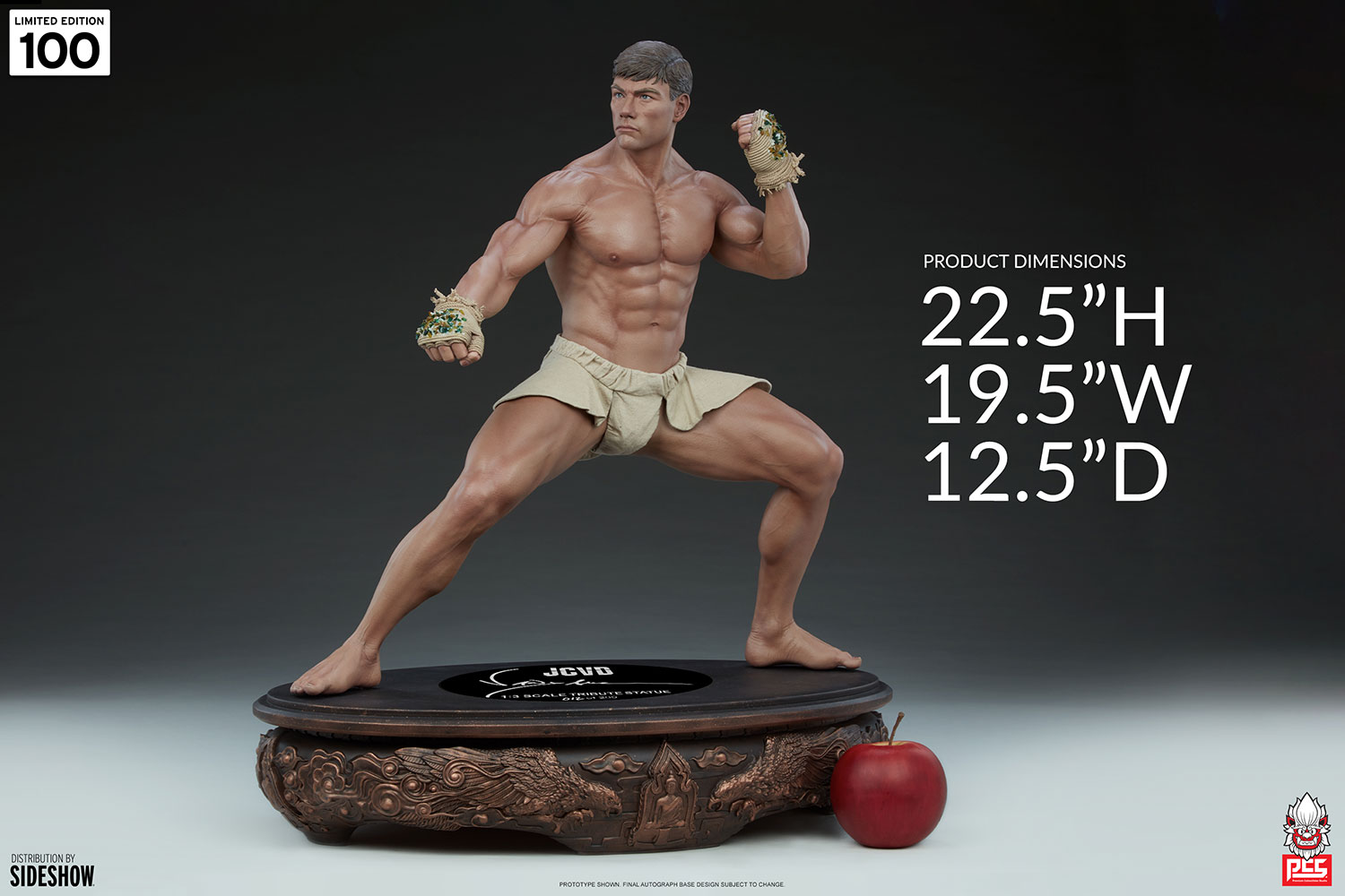 The JCVD (Jean-Claude Van Damme): Muay Thai Autograph Edition 1:3 Scale Tribute Statue measures 22.5” tall and 19.5” wide as an artful homage to “The Muscles from Brussels”. This ultra-realistic and highly detailed statue showcases the athleticism, dynamism, charisma, and muscles that made Jean-Claude Van Damme a global superstar and a fan-favorite for action movie aficionados.