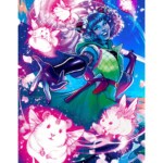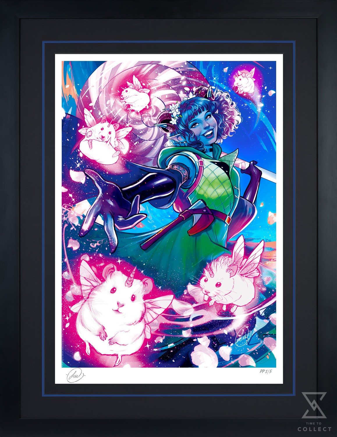 With a smile on her face and spells at her fingertips, the bubbly blue devilkin Jester Lavorre is ready to face all manner of danger with her friends, the Mighty Nein. The villains of Wildemount may carefully plot and scheme to exact their cruel plans, but what they can’t account for is the infernal healer’s chaotic illusions and trickery! This vibrant portrait captures the whimsical whirlwind that is Jester’s magic, as she summons a horde of glowing pink hamsticorns to guard her allies against harm. Just as sweet as she is formidable, she wields her ethereal lollipop weapon, ready to dish out a helping of just desserts against evildoers across Exandria.