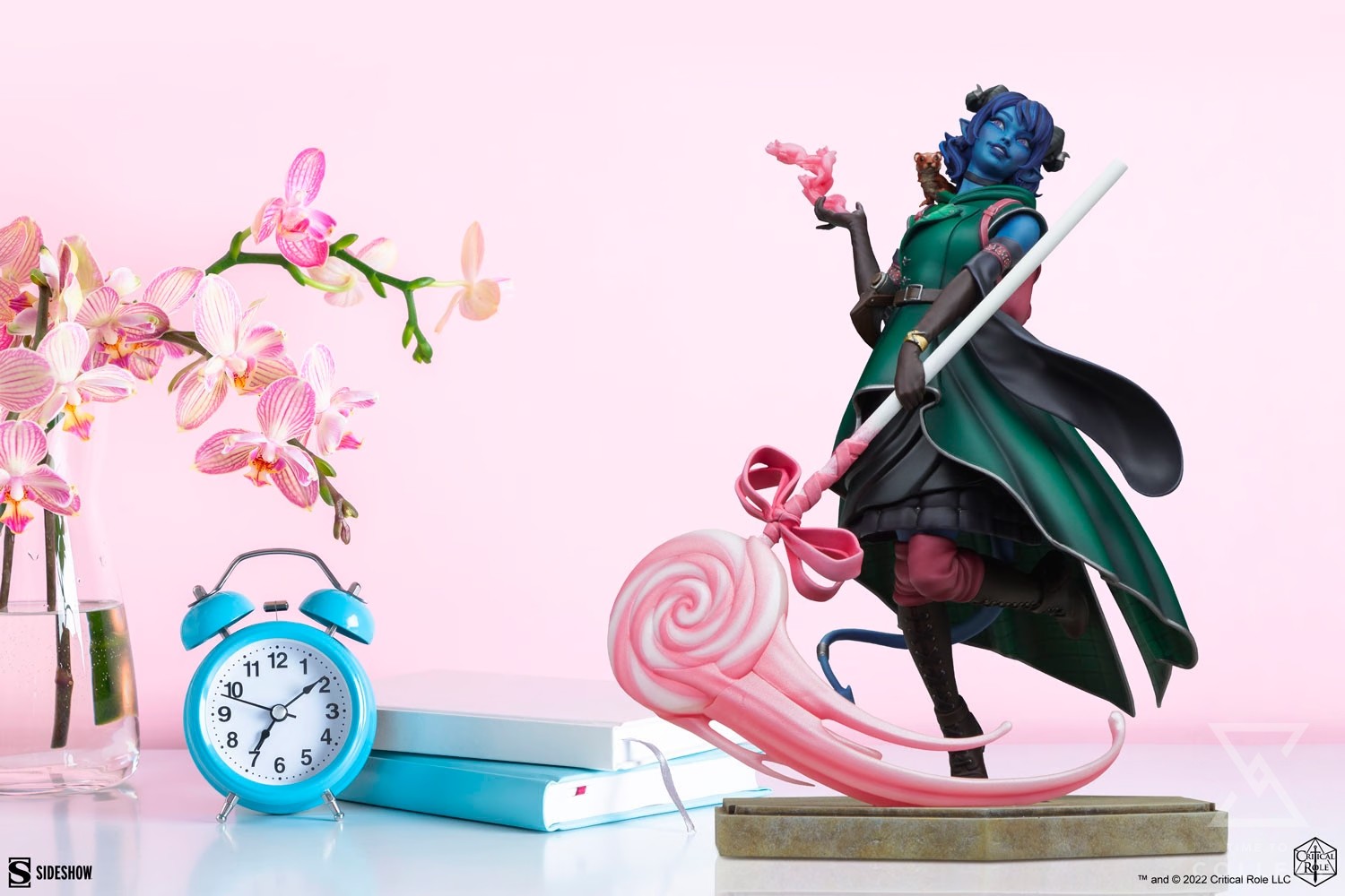 Hello, bees! A whimsical member of Wildemount’s latest band of heroes, devilkin Jester Lavorre wields her divine powers with glee, spreading the message of The Traveler wherever she goes. This Mighty Nein collectible showcases her sugary pink spellcasting, as Jester swings her ethereal lollipop weapon and summons a handful of hamsticorns to aid her allies. Sideshow’s Jester – Mighty Nein Statue wears her mid-campaign costume featuring a quilted green coat, open sleeves, layered skirts, and even her trusty pink haversack with a delicious blueberry cupcake tucked inside. Sprinkle, the crimson weasel, sits on her shoulder, ready for a new adventure to begin.