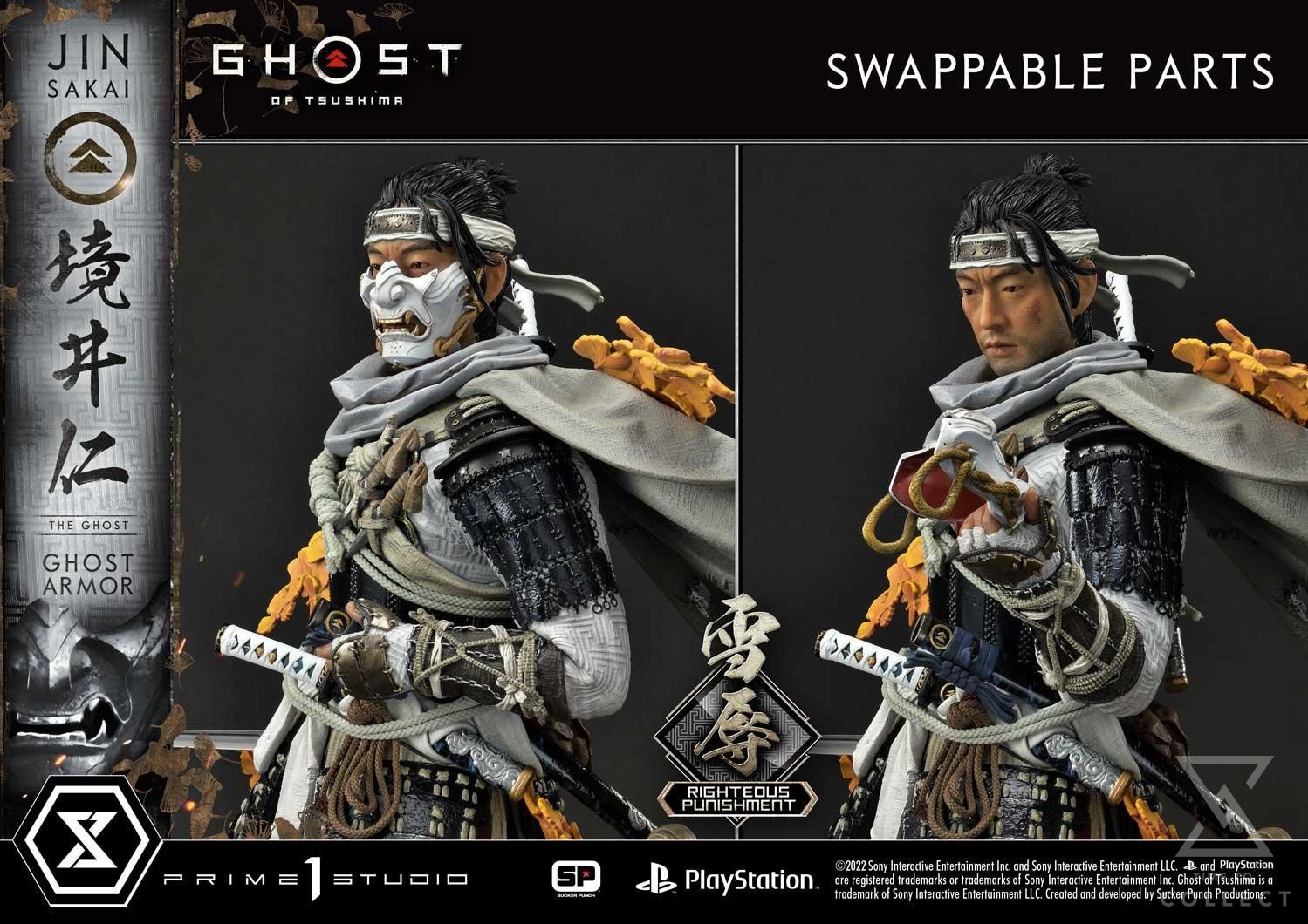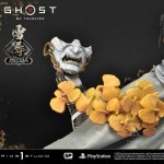 To match the expert sculpting of this beautiful figure, Prime 1 Studio’s painting team has accepted the challenge of an all-white armor set with subtle shading, artistic highlighting, and precise detailing. The result is a piece of art that is every bit as realistic as the fantastic game art. The Ghost stands ready to fight with his katana drawn on his fantastic environmental base. Jin stays still in a subtle whirlwind of golden Gingko leaves, ornate, moss-covered rocks steps, Japanese stone lanterns, and stonework Inari. To his side is a friendly Fox, ready to guide The Ghost to his next goal. Jin will come equipped with two (2) swappable heads (Mask on, Mask off), and two (2) swappable right hands (holding Scabbard, holding Mask).