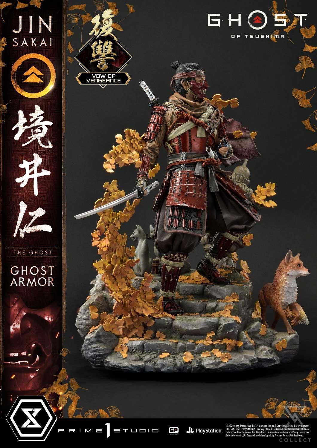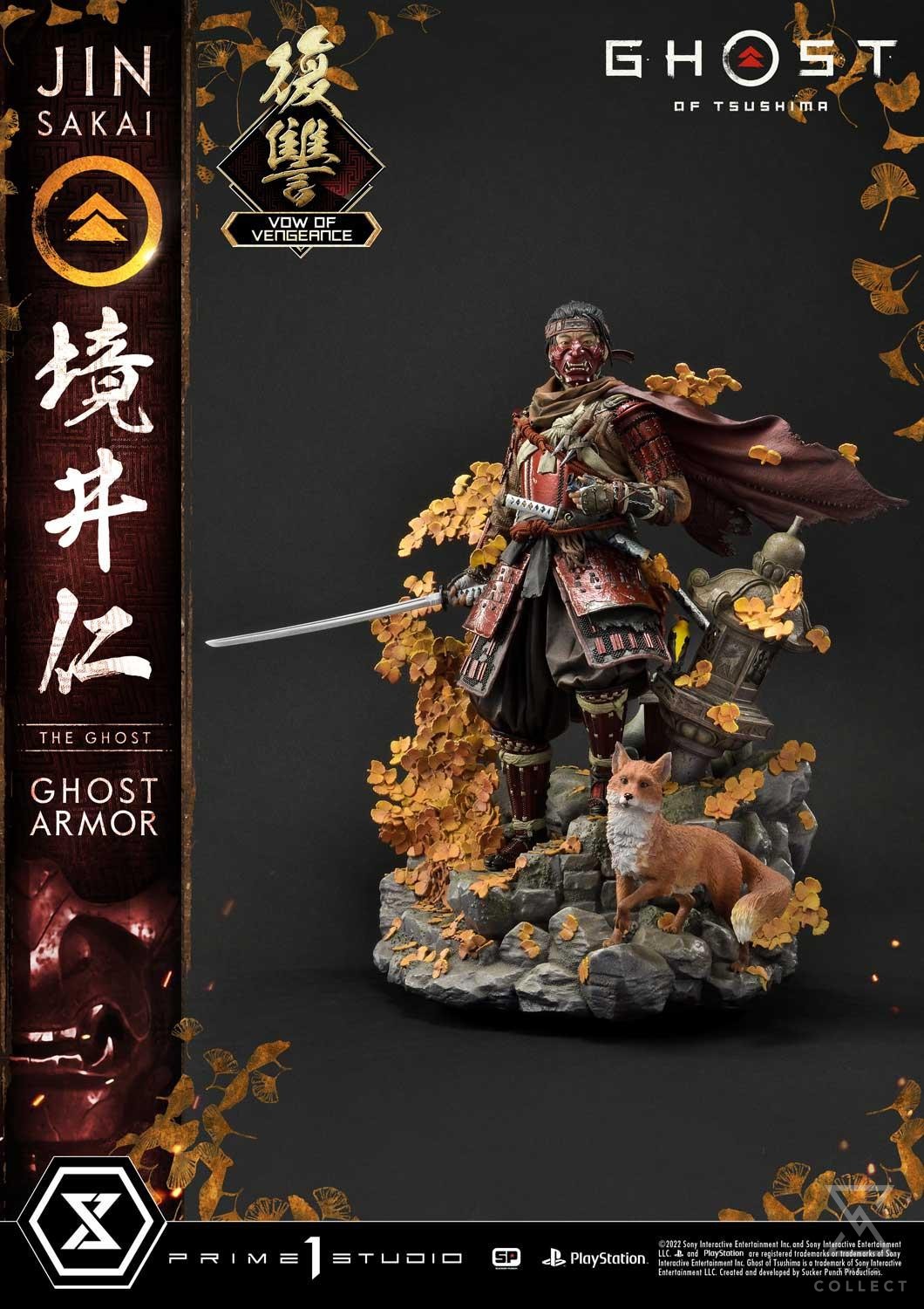 Prime 1 Studio is proud to present a follow-up to our hit Jin Sakai Ghost Armor statue: the 1:4 Scale UPMGHOT-04LM: Jin Sakai, The Ghost “Vow of Vengeance Ghost Armor” from Ghost of Tsushima! Prime 1 Studio brings back a limited-edition Jin Sakai with a new dye set for a fan-favorite armor. Limited to 150 pieces, this 23-inch-tall stoic statue stands still in a slight breeze, surrounded by golden Gingko leaves and a friendly fox. Enrobed in Rank III Ghost Armor dyed in Vow of Vengeance, Jin boasts a bloody, red silhouette. Jin’s menpo, or facemask, presents a frighteningly demonic visage! All over this detailed statue, you can see each and every part, plate, and cord that keeps this armor together. The high level of precision on this statue is breathtaking!
