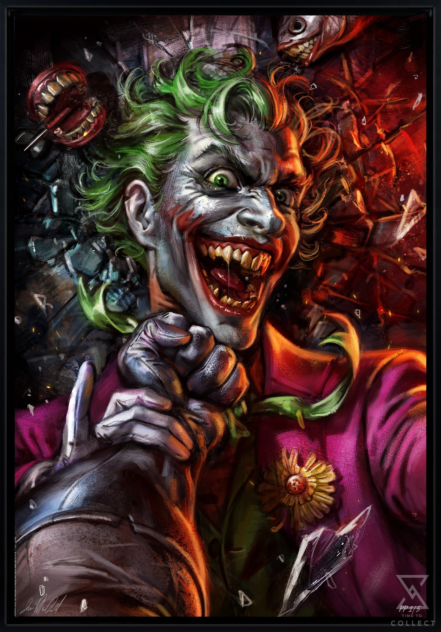 Batter batter, SWING! With blood-red lips pulled wide over yellowing teeth, The Joker smiles his way through a brutal beating by Batman. The Joker’s green hair is spread across a floorboard scattered with toys, broken glass, and sneering Joker fish. He wraps one gloved hand around Batman’s wrist — but whether it’s to stop or encourage the next blow, it’s impossible to tell.
