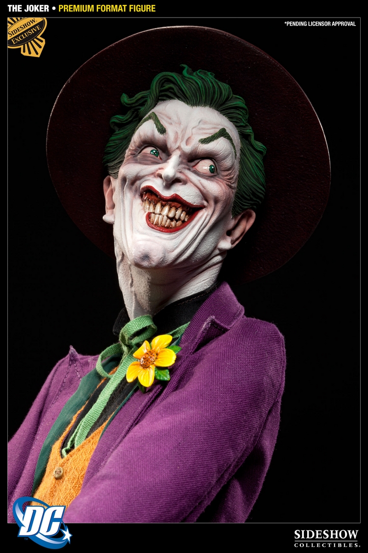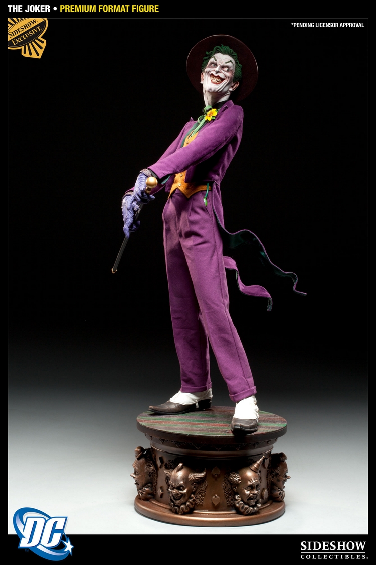 Launching Sideshow’s all-new line of DC Comics Collectibles is The Joker Premium Format Figure, presenting the maniacal archenemy of Batman in stunning detail. Each piece is individually painted and finished to exacting standards, each with its own unique quality and detail that is the trademark of a handcrafted Sideshow Collectibles product. Captured in approximately 1:4 scale, with an intricate real fabric costume that features a fully lined topcoat with pose-able tails, The Joker Premium Format Figure is an outstanding addition to any display, the perfect beginning to Sideshow’s DC collection.
