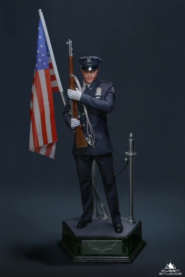Why does no one notice the Joker disguised as a policeman at Commissioner Loeb’s funeral at City Hall? A question many of us have asked ourselves. The most plausible answer is this agent of chaos is a criminal mastermind. He almost single-handedly brought Gotham to its knees. The only opponent to truly beat The Dark Knight. Although Batman won and sent the Joker to Arkham, it was a very costly victory. After such a positive reaction to our Dark Knight Collection, Queen studios is excited to bring you our 1/3 scale Life-life The Joker (Police Uniform).