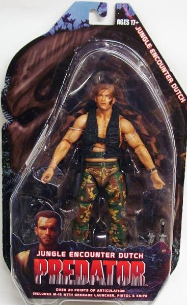 Jungle Encounter Dutch is faithful to his appearance when he first encounters the Predator in the jungle, complete with all new shirtless torso and military vest, features over 20 points of articulation, an M-16, Pistol, and Knife accessories.