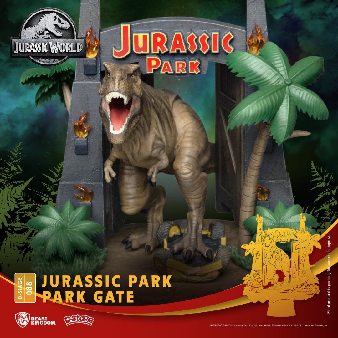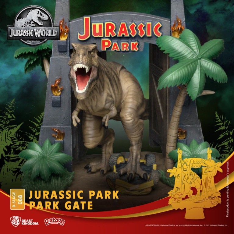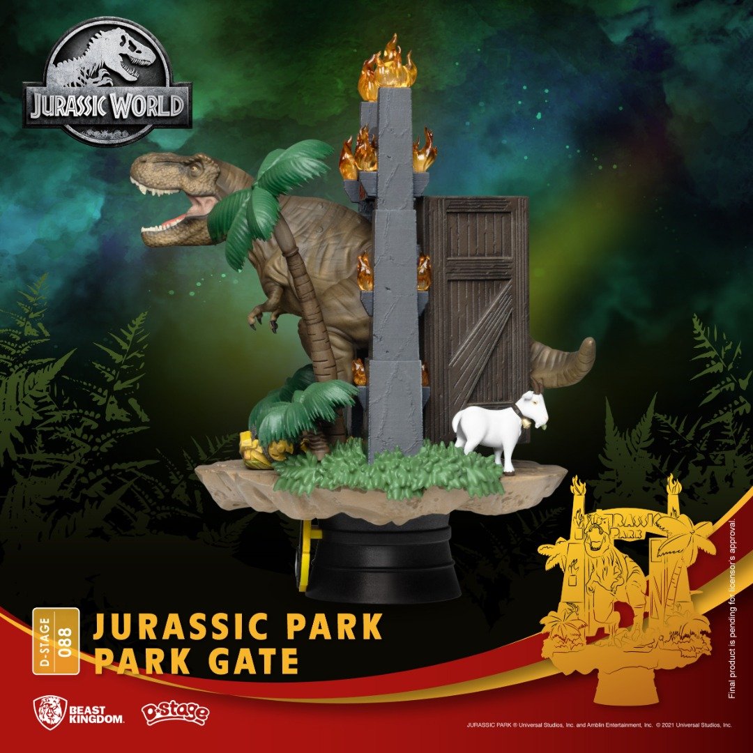Beast Kingdom is proud to present a new addition to the D-Stage series, the Jurassic Park Gate. The classic T-Rex logo from the first movie is reproduced on the gate and surrounded by the “ancient” scenes of the park. To bring back the excitement for all of the dinosaur fans, there is the biggest carnivore on land, Tyrannosaurus Rex. With its incredibly strong body and seemingly countless razor teeth, no creature can easily escape a T-Rex in pursuit. A goat stands in back to draw the hungry T-Rex out of hiding. Can you safely escape the hunt of the T-Rex? This is a classic collectible that dinosaur fans must not miss!
