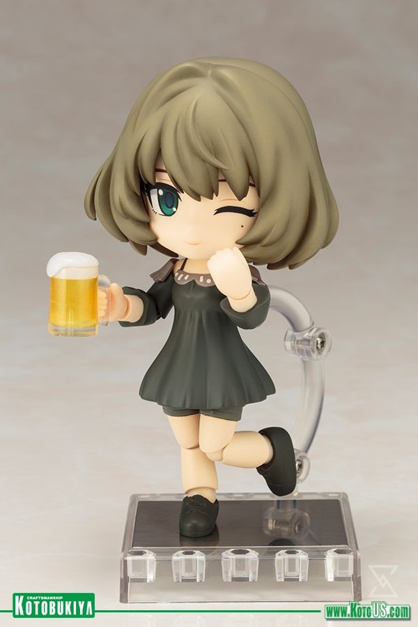 A Kotobukiya Japanese import! Coming to you from the Japanese hit video game and anime series Idolm@ster, bringing the fast-paced and exciting world of managing pop idols to life, is the next in Kotobukiya’s lineup of adorable Cu-Poche figures. Shrunk down to an adorable size is the cool and quiet pun master Kaede Takagaki who looks great as a poseable and fun Cu-Poche figure featuring multiple points of articulation and magnets in her feet for extra stability on her included base. The wine-loving Kaede wears a cute dress with frilled collar, shorts, and chunky shoes, and you can customize the girl’s look with tons of accessories and alternate parts. She comes with a smiling face, a winking face, and a love-drunk face as well as an open hand, closed hand, holding hand, and a hand clutching a sake cup. Kaede even brings along a beer mug, sake set, and aroma diffuser used in The Idolm@ster: Starlight Stage! Sculpted by Kei Tanaka, Kaede Takagaki stands 4 ½ inches tall and has multiple points of articulation for a high degree of poseability. Bring home this cute little singer for your collection!