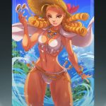 Faithfully recreated based on her in-game character model, Karin’s summer costume is entirely sculpted and features a breezy white jacket and a patterned bikini. The Kanzuki heiress has a toned, athletic physique and decorative, colorful jewelry including necklaces, bracelets, and strapped sandals. Her portrait is detailed with large, perfectly curled blonde ringlets beneath a wide-brimmed sun hat with a large pink bow, completing Karin’s posh ensemble.
