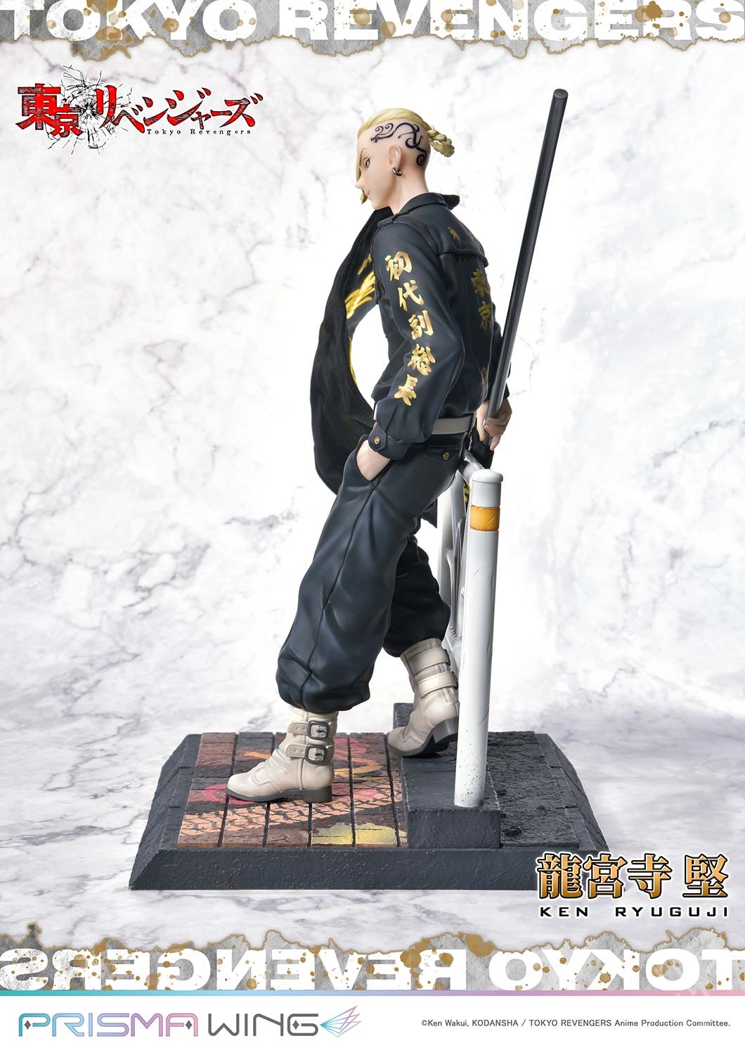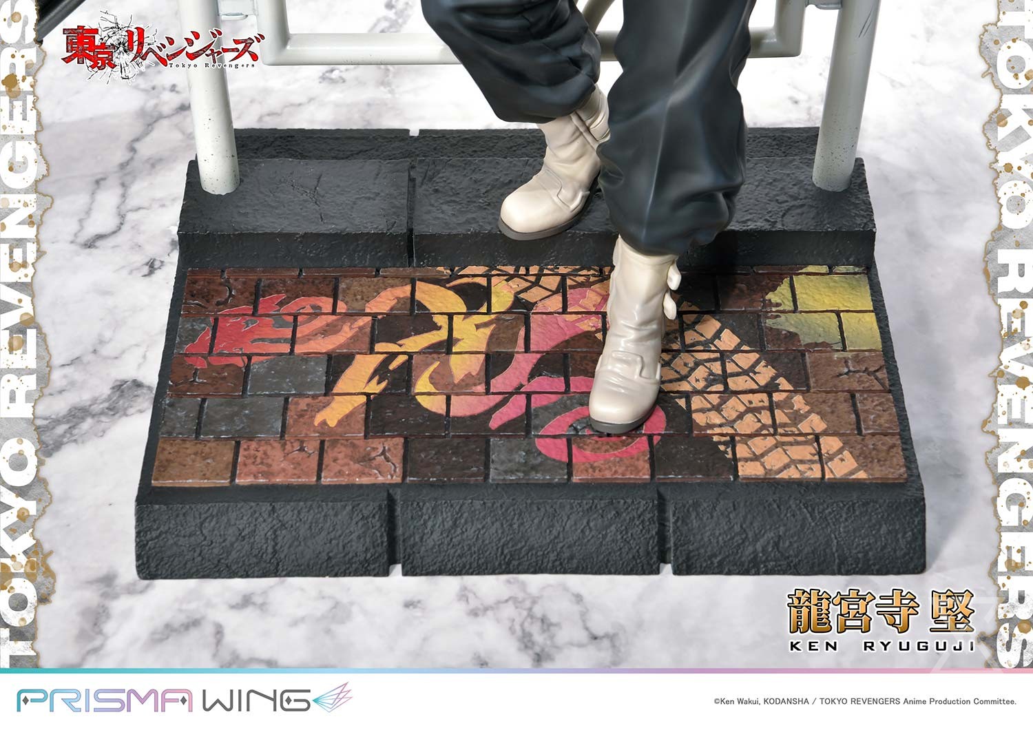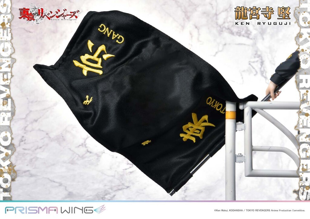 From the thrilling time-travel suspense TV anime “Tokyo Revengers” that has taken the world by storm, Ken Ryuguji, a.k.a. “Draken,” makes his debut! Leaning up against a guardrail in the bustling streets of Shibuya, the Vice Captain of the First Generation Tokyo Manji Gang holds a flag firmly in hand. Just like the previously released “Invincible Mikey” Manjiro Sano, his design is based on original artwork illustrated just for PRISMA WING. From his piercing gaze and silver earrings to his golden braided hair and the roaring dragon tattoo on his left temple, every detail captures Draken’s essence brilliantly, just as depicted in the series. The carefully painted and sculpted biker jacket, which envelops his towering 185cm stature, pays attention to even the smallest details such as the Vice Leader’s embroidery and the buckles on his bootstraps. The eye-catching flag held in his right hand is made with fabric material embedded with wiring to allow for dynamic posing. The specially designed base accented with graffiti adds an extra layer of style to the display. Moreover, the exclusive bonus version available only on the official online store includes a limited button badge featuring the original concept art! This item is a must-have addition to any collection. With this addition, Draken’s stoic fighting prowess is portrayed masterfully. Display him alongside Mikey and witness the dynamic presence of the Tokyo Manji Gang’s top two leaders!