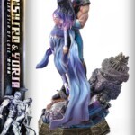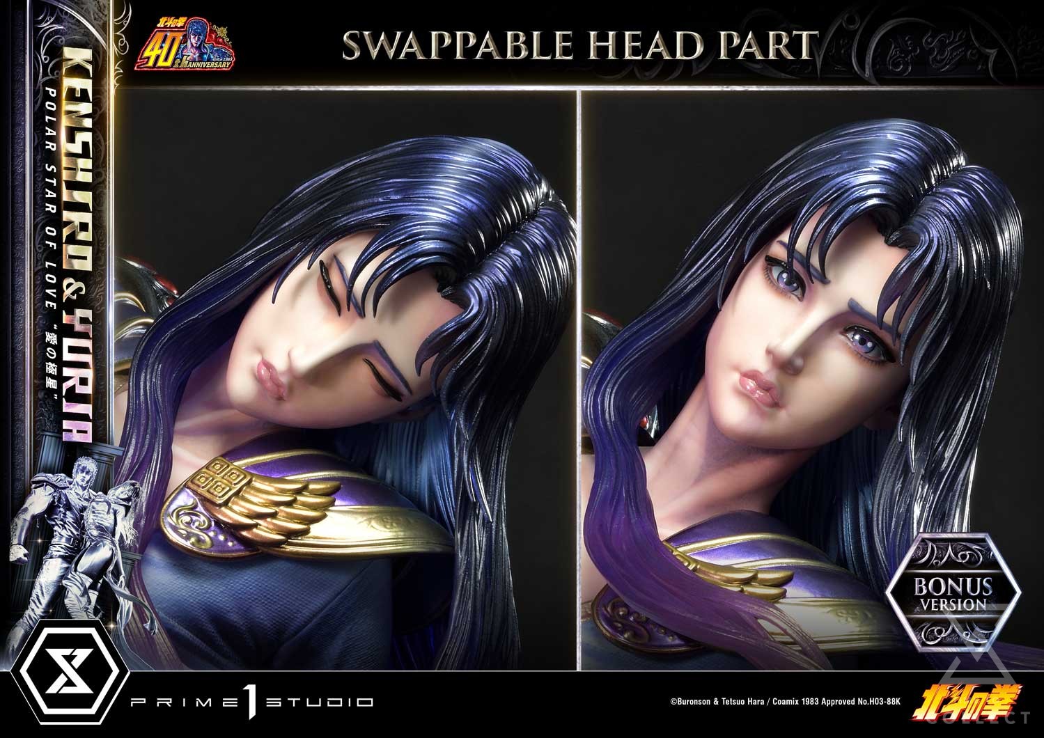At almost 28 inches tall, one can easily recognize Kenshiro’s muscular physique! Finally reunited with Yuria, after a long and arduous chase. He holds her firmly in his embrace and stands ready to face any opponent that may come as he flexes his large, V-shaped upper body. Determined to protect her with all his might, he clenches his fist firmly, displaying long veins along his right arm. His distinctive Big Dipper constellation scars can be seen on his well-developed upper chest. He bears an intense gaze as the fire in his heart burns bright in this dark world. The beautiful Yuria has her arm wrapped behind Kenshiro’s neck, she has her eyes closed, fair skin, and soft pink lips, she remains just as gracious as ever. While still in a weakened state, her slender figure still embodies a delicate and refined demeanor, a true display of feminine beauty and elegance! Our skillful painters have done an outstanding job recreating the fading of her hair color from black to violet. The vivid contrast between the characters’ blue and purple is painted with the utmost attention to detail as it perfectly portrays the way they were both masterfully drawn in the original manga while still giving them a breath of life through realistic texturization. The base features remnants of destroyed pillars as well as the head of one of the Four Heavenly Kings. And when you order the Bonus Version from our official store or any authorized distributor, you will receive an exclusive bonus part. It’s an additional swappable head part where Yuria’s eyes are open, letting us gaze into her bright violet pupils.