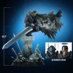 At 17 inches tall, Guts dons his iconic Berserker armor, perched atop a stone pillar surrounded by the skulls and weapons of his fallen enemies. Each plate is carefully painted with shades of black and blue. He wields the iconic Dragon Slayer, a massive sword that has stayed by his side since Gut’s first apostle kill. His large cape flows to his side, as the wind blows behind his back, adding heavy atmosphere and gloom to this stunning piece. Our talented artists and sculptors have masterfully etched Guts’ face in the cape, creating a captivating and gothic visual experience – sure to leave anyone gripped by the dreamlike ambiance.