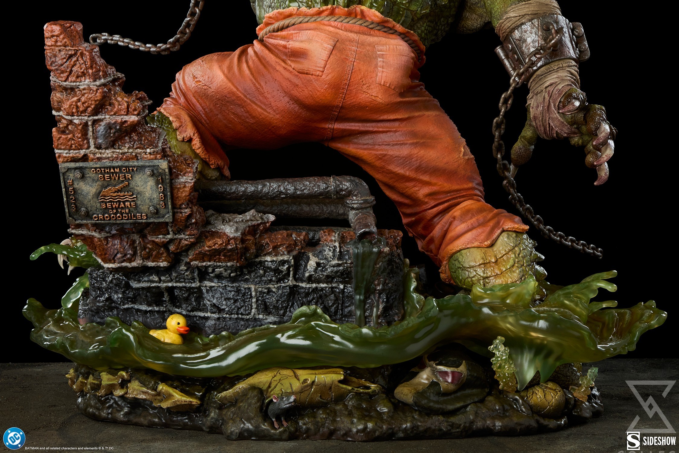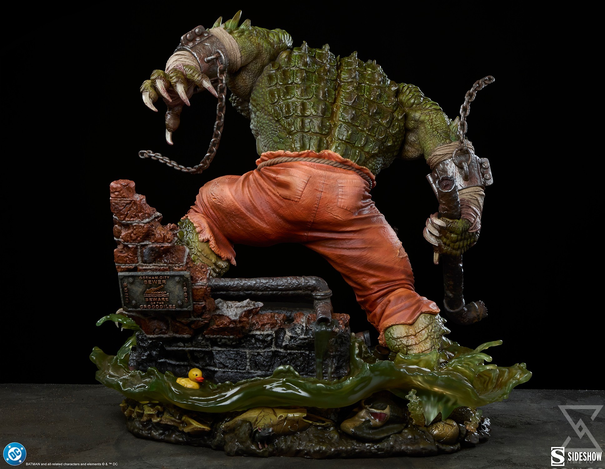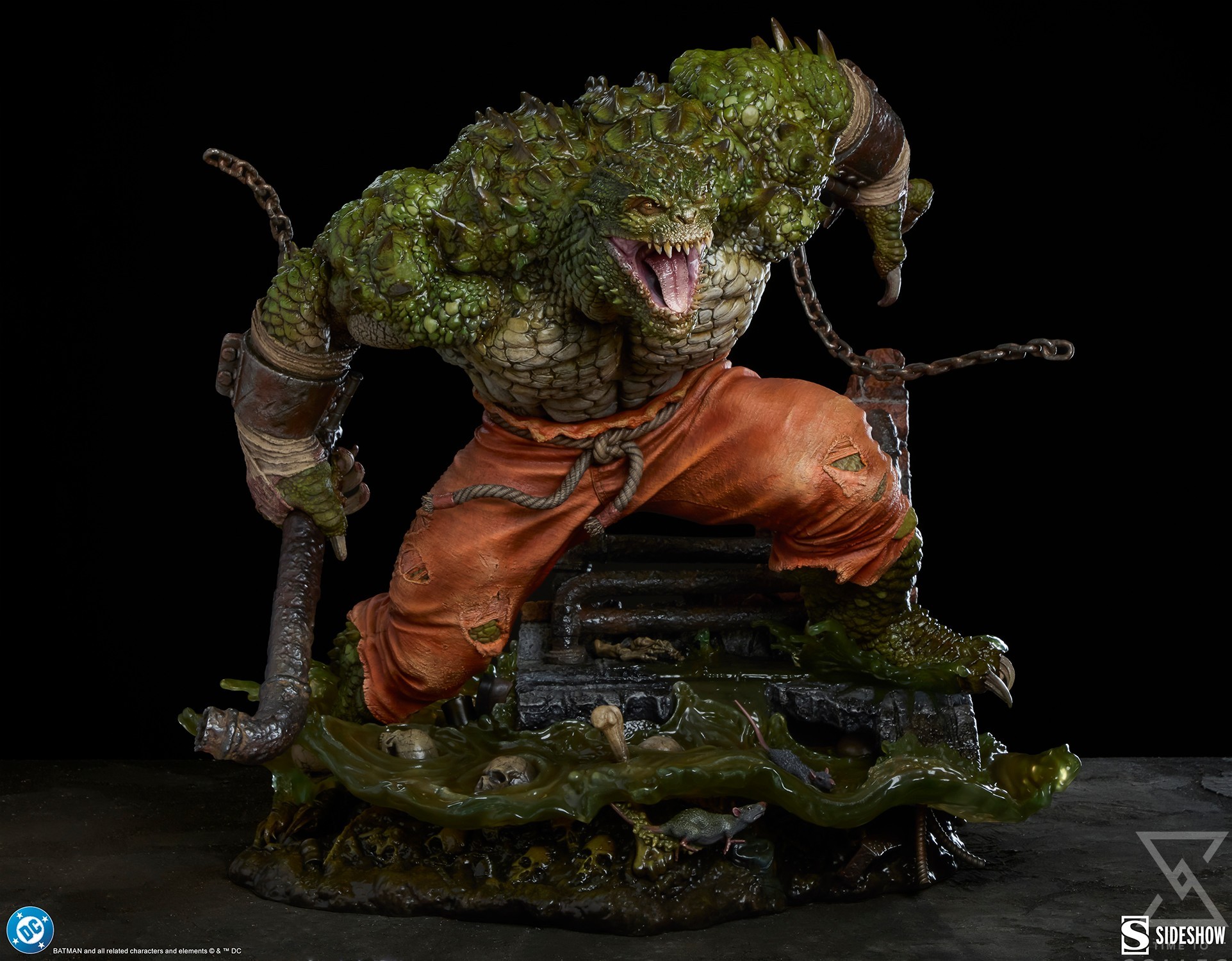 Inspired by the character’s comic book appearance, this fully sculpted Killer Croc collectible showcases a Rogues Gallery member in the depths of animal desperation. An unrivaled swimmer, Killer Croc has collected a few mementos from his battles and hidden them where only he and the rats can reach. The DC statue’s immensely detailed base includes further allusions to his past, such as skeletons and Bane’s mask, all drowned under sloshing green water. Additionally, significant numbers on a sewer sign reference important dates in Killer Croc’s publication history. Waylon’s shackles and torn orange pants indicate an escape from Arkham, which could not contain his thick hide. The Killer Croc Premium Format™ Figure also includes a swap-out right hand holding a pipe. It is a formidable weapon when wielded alongside razor sharp teeth and a terrifying crocodile tail.