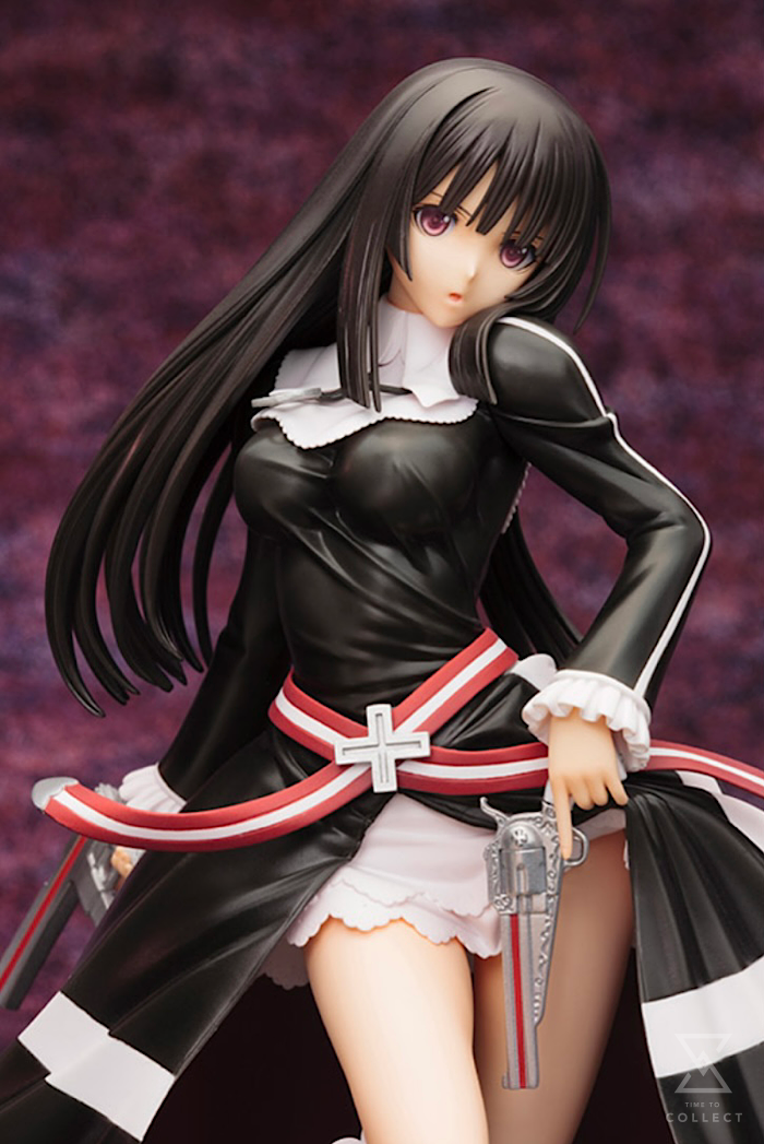 A Kotobukiya Japanese import!The lovely ladies of the “Shining” series from SEGA have made for an incredible line of Ani*Statues, and now Kotobukiya is proud to present the newest member from the latest game Shining Ark. Joining Sakuya in Seraphim Mode is the “red eye exorcist” KILMARIA AIDEEN! Inspired by Tony Taka’s artwork, Kilmaria looks like she stepped straight out of the game and is ready for action with her trademark weapons in hand. Captured in mid-stride as she explores ancient ruins, the handgun fighter takes a tall step over the broken path, her long flowing dress billowing out around her. Kilmaria’s outer garment is fringed in white, and around her waist is a red and white ribbon-like belt with a silver cross buckle. The exorcist carries two handguns, a heavy pistol with extended magazine and an intricately engraved revolver, and from the look in her red eyes she’s not afraid to use them. Kilmaria is beautifully detailed with all of the subtle movement in her clothing (not to mention the fancy fringes!), and the contrast between the black of her dress and hair and her light skin is striking. Kilmaria Aideen stands nearly 8 inches tall (1/8 scale) and is a perfect addition to your Shining series Ani*Statue collection!