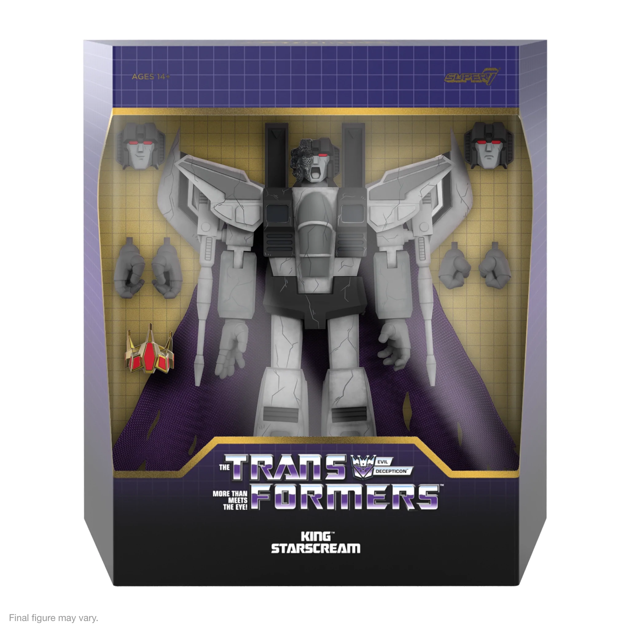 Starscream thought it was finally his moment to rule the Decepticons, but how wrong he was! Inspired by the iconic scene from the 1986 animated film The Transformers: The Movie, this 7” scale highly articulated Transformers ULTIMATES! Figure depicts Starscream’s shocking death at the hands of Galvatron. In grayscale with menacing red eyes, multiple interchangeable heads & hands, a removable crown, and poseable tattered cape, this is a figure every Transformers movie fan needs in their ULTIMATES! collection!