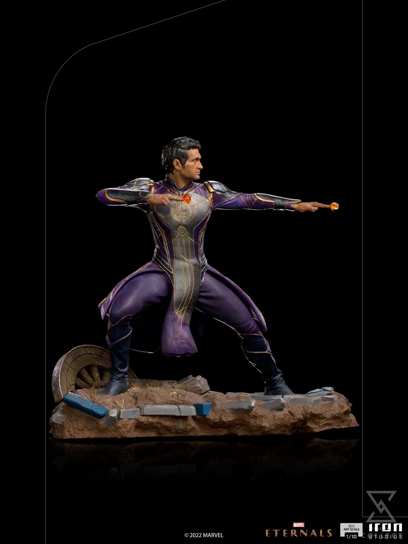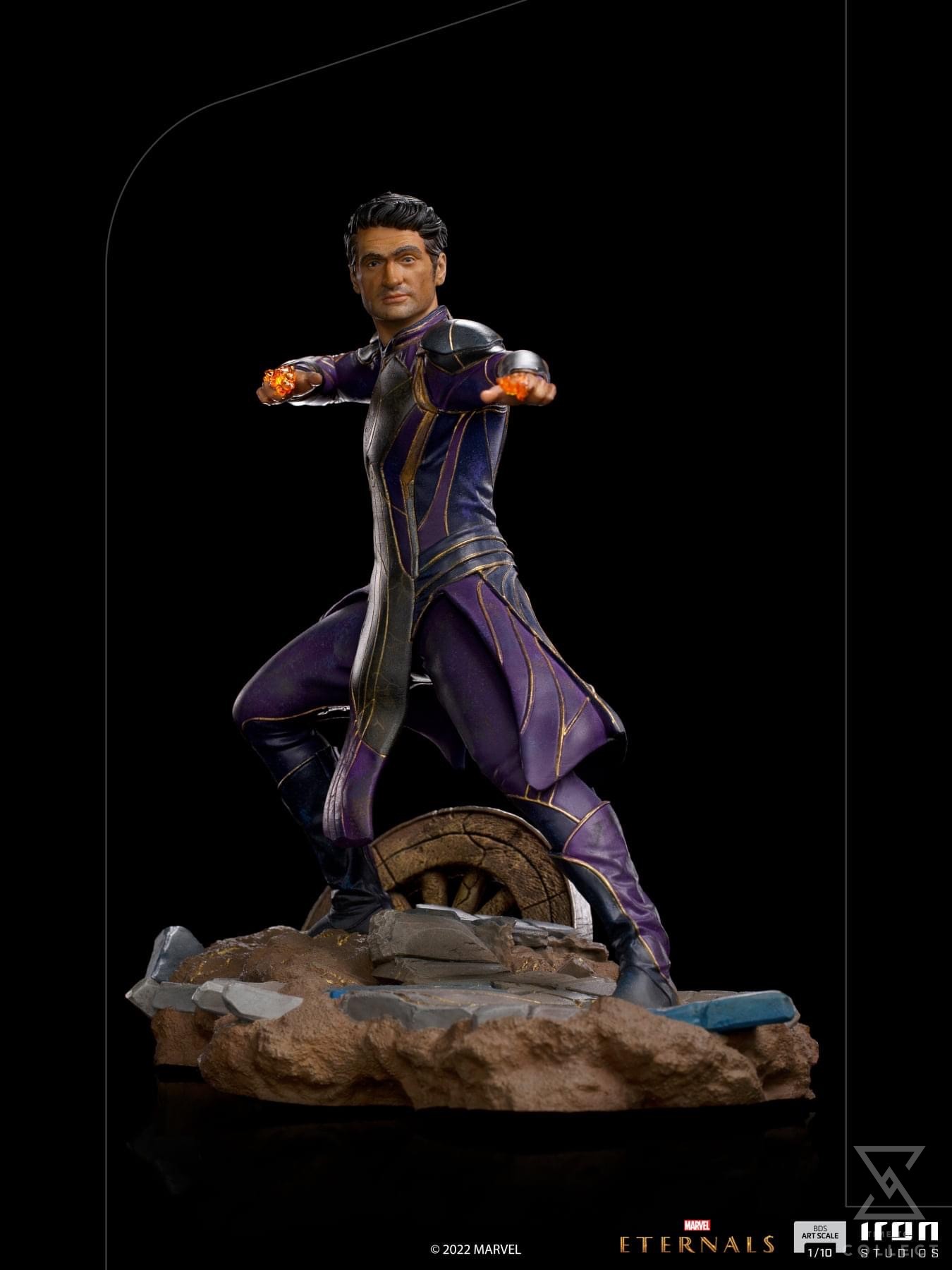 Confident and always prepared for action, he points his fingers ready to shoot spheres of cosmic energy. An extremely skillful combatant with millions of years of training and experience, he fell in love with the spotlights of fame, richness, and comfort, establishing himself in India, he because a famous star in the cinematographic industry of Bollywood. To hide his immortality, he faked being the descendant of a single lineage of actors. With his purple celestial armor, Iron Studios bring the statue “Kingo BDS – Eternals – Art Scale 1/10”, with the actor, dancer, director, and superhero member of the Eternals in the fight against the Deviants.