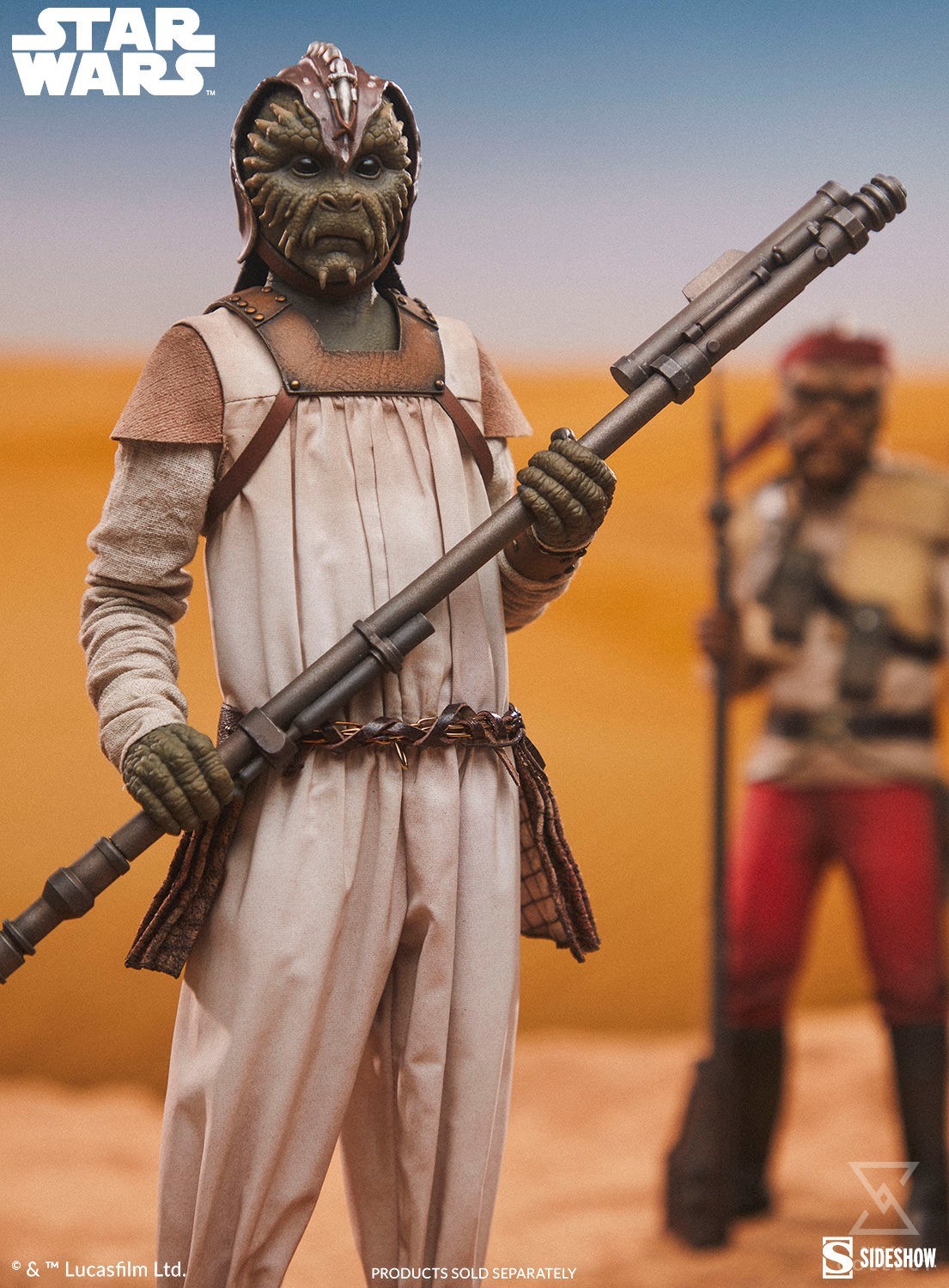 Inspired by the character’s appearance in Return of the Jedi™, this fully articulated, highly poseable high-end Star Wars figure wears tailored fabric clothing accurate to his on-screen ensemble. His outfit consists of a tan vest, trousers, and hood, as well as armor befitting a henchman in Jabba the Hutt’s entourage. The Klaatu™ Sixth Scale High-End Collectible Figure also wears a belt laden with thermal detonators across his chest and includes a pair of relaxed hands and a pair of gripping hands for the vibrostaff accessory.