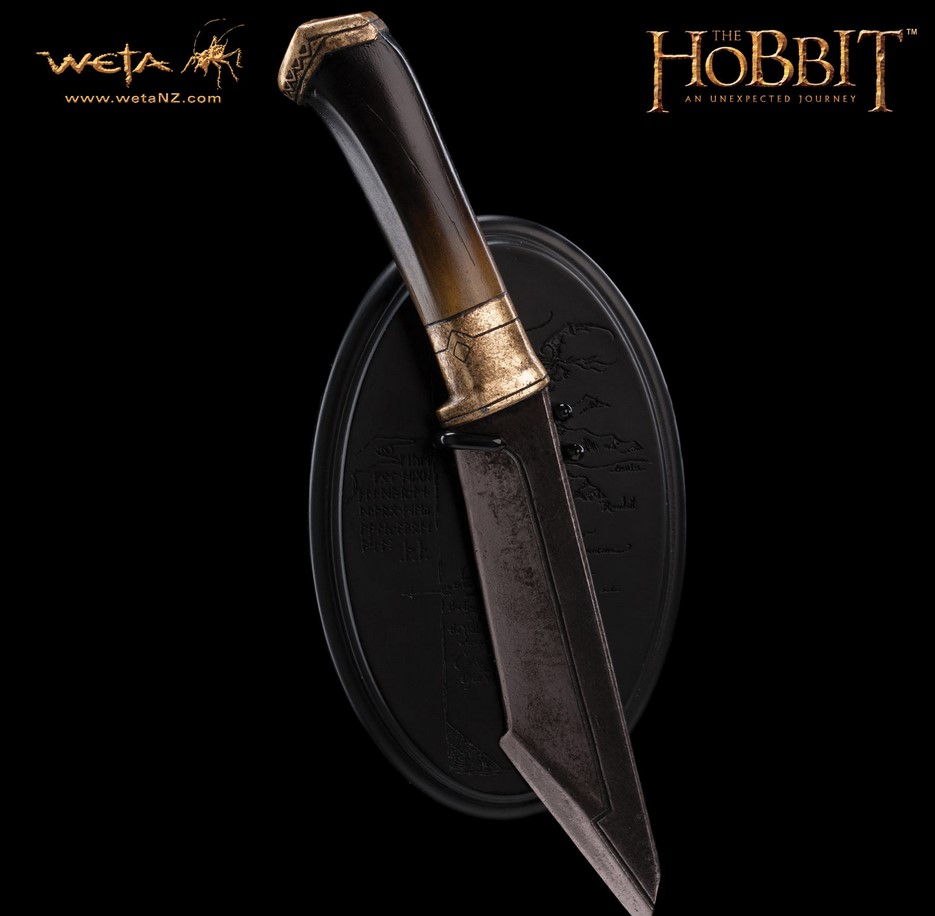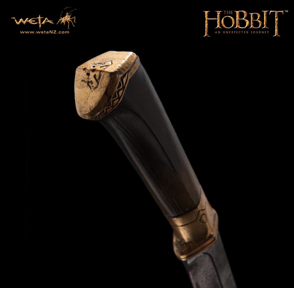 This prop replica has been created from molds of the original weapon used in the film, using the same high impact urethane material as the props on set and finished using the same techniques and materials. “Although we use steel and aluminium to make a lot of our swords, often we benefit from the casting of these in a high impact urethane as we are able to capture the complexity of detail we are wishing to cast into some of our weapons. We have therefore chosen to present our collector’s edition of Hobbit weapons in the same material used for the making of the film props to exactly replicate the techniques and artistry used in the films.” (Richard Taylor, Special Effects Supervisor at Weta Workshop)