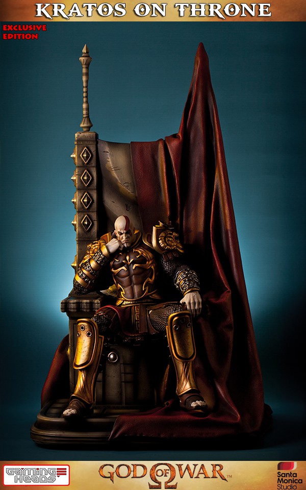 Gaming Heads is proud to showcase Kratos on Ares’ Throne, depicting the ultimate scene at the end of the original God of War. The entire scene has been cast in high quality polystone resin, and has been hand painted to allow for the most intricate of detailing. Kratos is depicted at ¼ scale, meaning that the entire piece is a breathtaking 29 inches tall to the top of the throne’s spires.