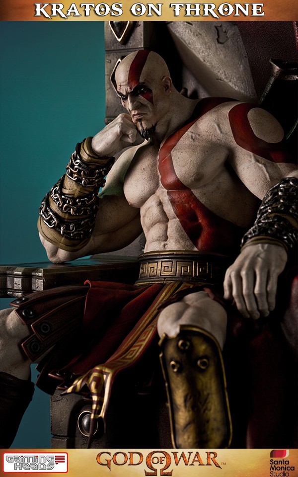Gaming Heads is proud to showcase Kratos on Ares’ Throne, depicting the ultimate scene at the end of the original God of War. The entire scene has been cast in high quality polystone resin, and has been hand painted to allow for the most intricate of detailing. Kratos is depicted at ¼ scale, meaning that the entire piece is a breathtaking 29 inches tall to the top of the throne’s spires.