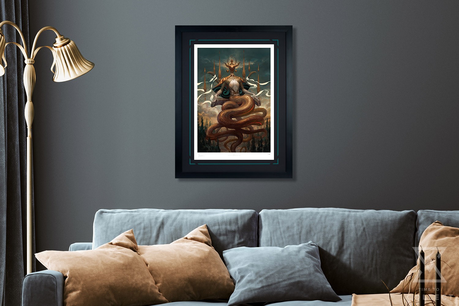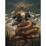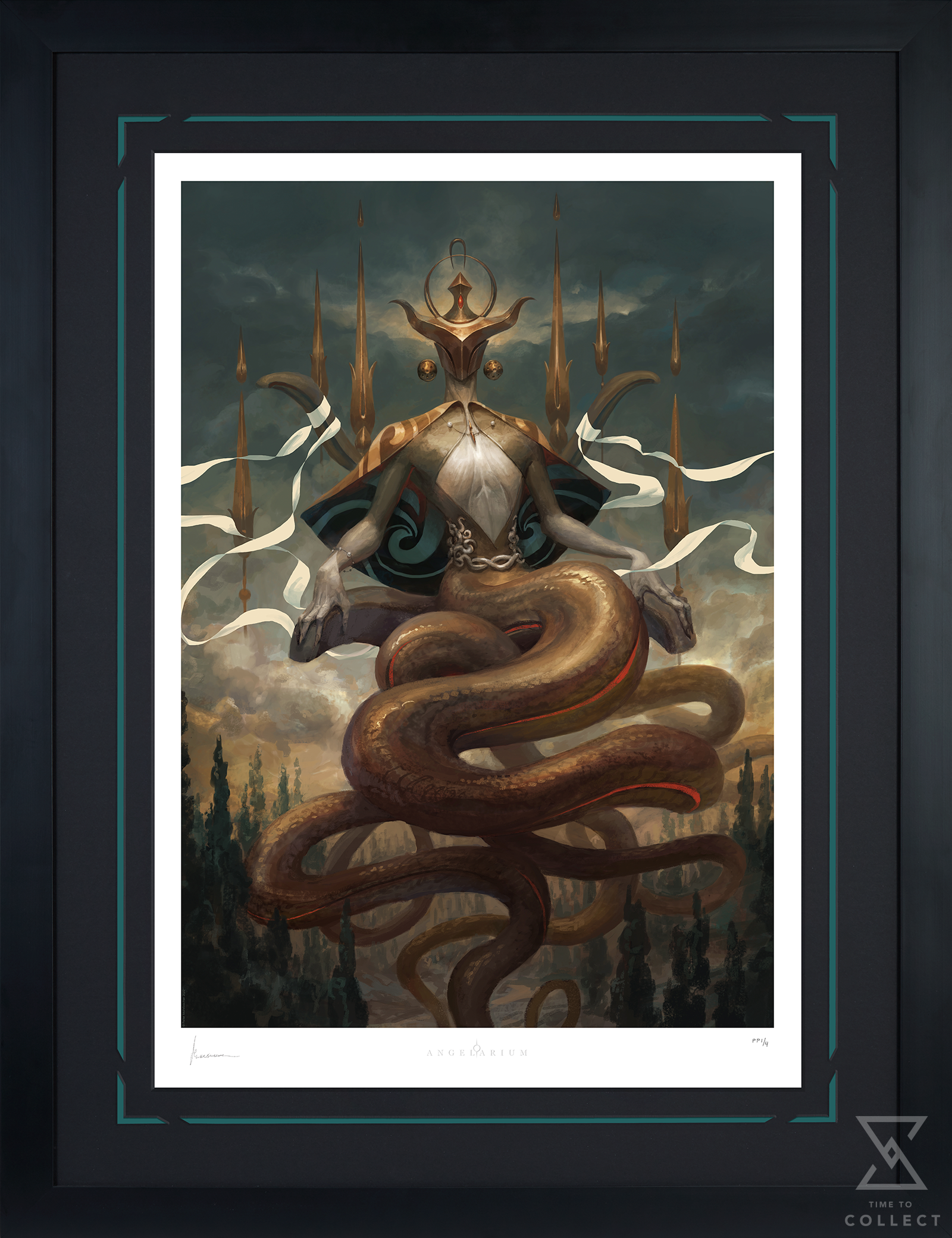 From the mind of Peter Mohrbacher, the Angelarium project has grown into an artistic anthology of designs inspired by numerous named angels throughout mythology. The Angels of the Zodiac embody the cardinal constellations that sit along the sun’s celestial path. The mysterious Kundaliel embodies the symbolic “serpent-bearer” Ophiuchus in cosmic tradition. The Master’s numerous snake tails ripple gracefully, seated on a throne above the climbing heights of a forest.