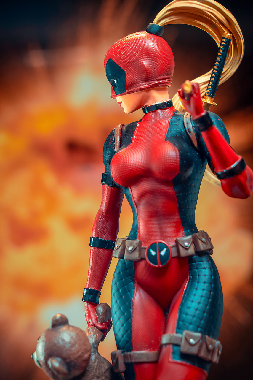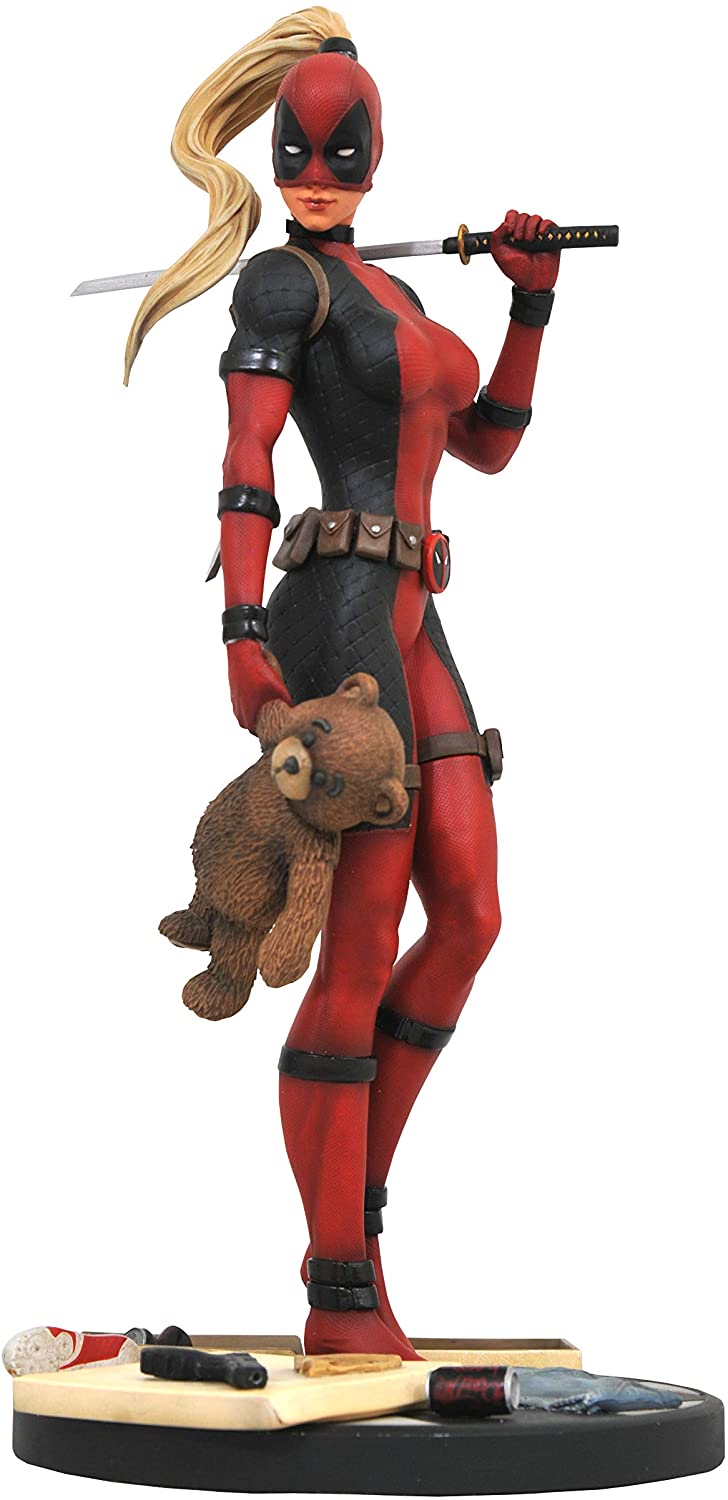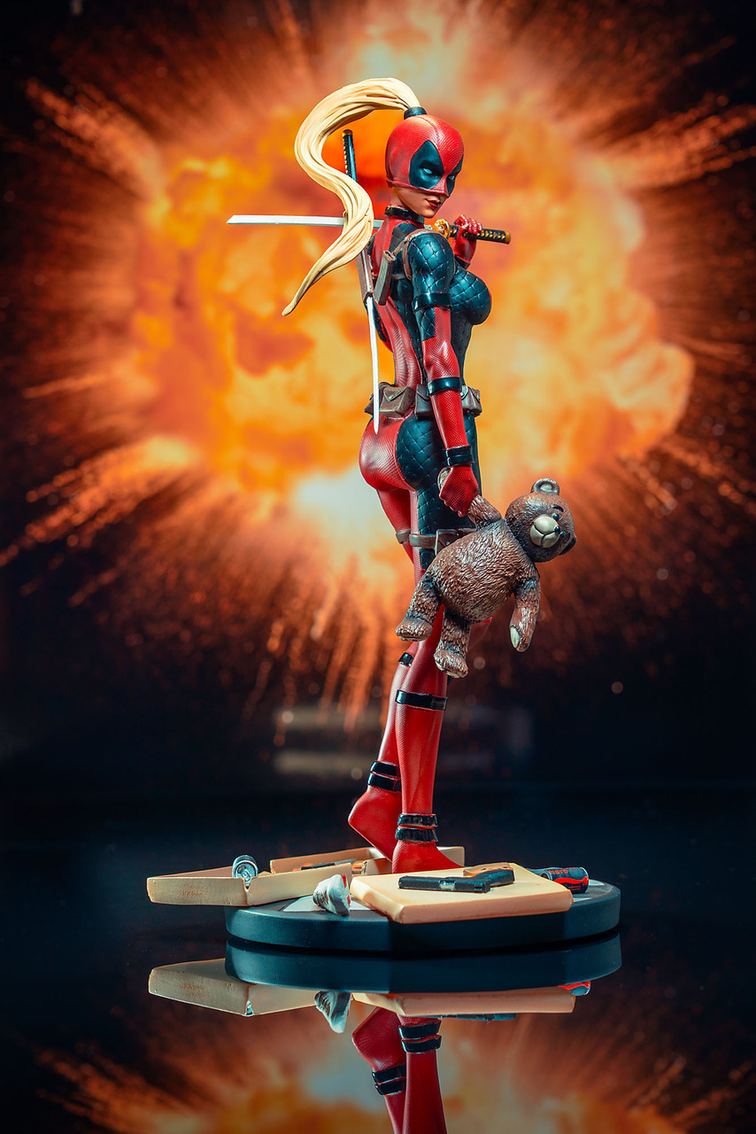 One of the traits Deadpool shares with his alternate-reality female counterpart is their ability to feel at home in the messiest of environments. This statue captures a partially unmasked Wanda Wilson in her natural habitat, with pizza boxes, pistols, cans and cut-offs scattered around her feet, a comforting teddy bear in one hand and an equally comforting katana in the other. This approximately 12-inch resin statue is limited to only 3,000 numbered pieces, and comes packaged in a full-color hand-numbered box. Sculpted by Alejandro Pereira based on a design by Caesar!