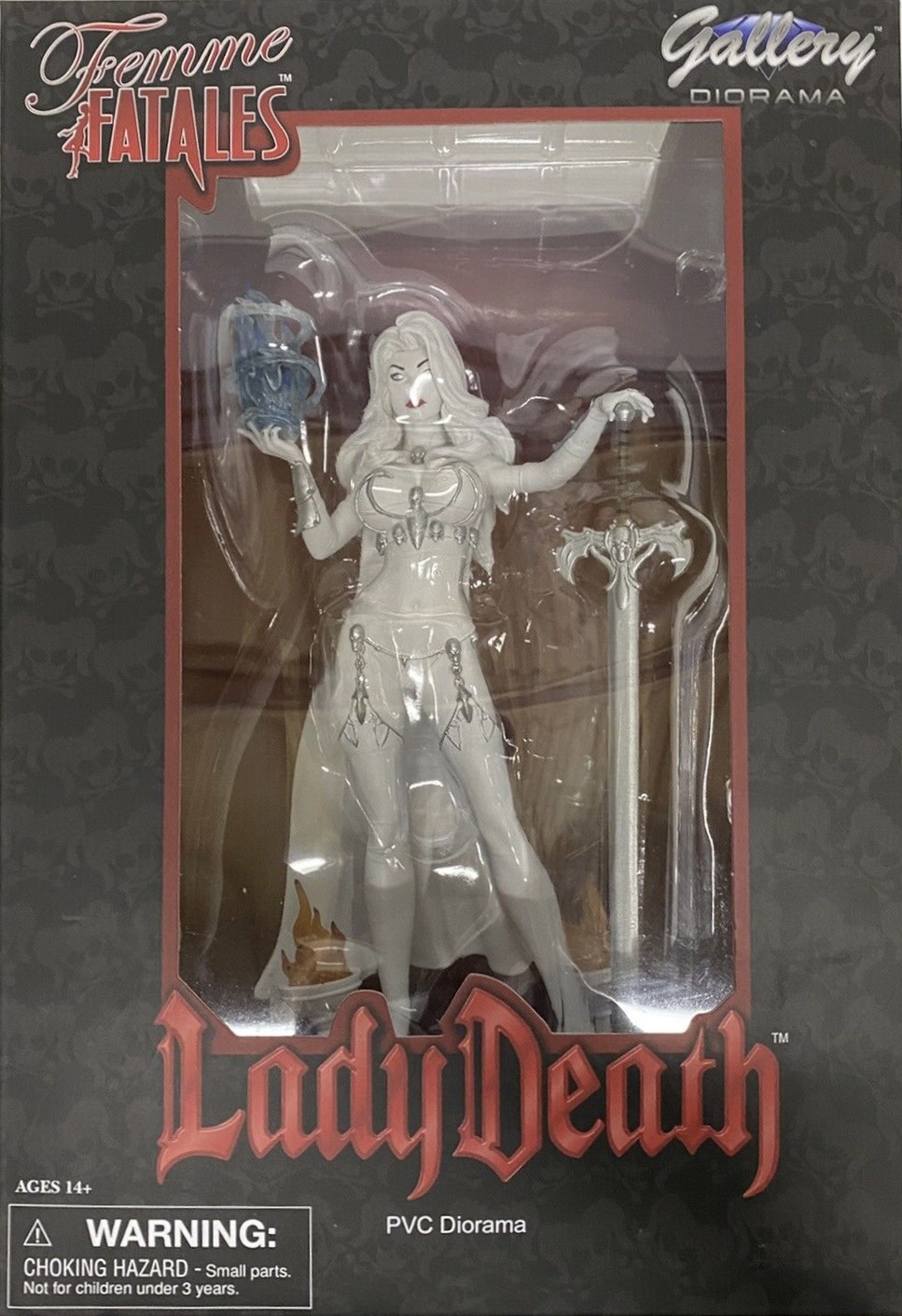 A Diamond Select Toys Release! Lady Death: A tale of innocence betrayed and then reborn as a powerful force capable of challenging the very roots of evil itself. Her legend dates back to the dark ages. She was a beautiful, young woman named Hope, but tricked by demons, she renounced her humanity to save her mother’s soul and was condemned to Hell. To survive, she harnessed the darkness within and forged herself into a warrior dreaded by all who cross her path. To know her is to know a woman cursed, but to oppose her is to know eternal agony. This all-new Femme Fatales PVC diorama of Lady Death is constructed of high-grade plastic and features a high level of detail and an exacting paint process. Lady Death created by Brian Pulido, costume designed by Eric Basaldua, sculpted by Sam Greenwell.
