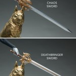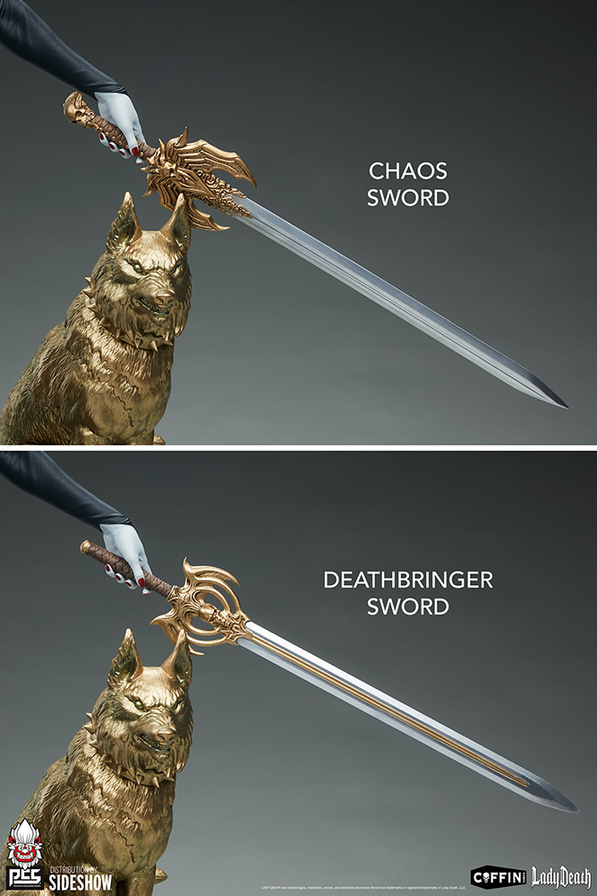 The Lady Death Statue measures 30.5” tall and 28” wide as Hell’s queen descends an ornately detailed gold staircase flanked by a pair of snarling hellhound sculptures. She holds a skull-tipped scythe in one hand and her legendary sword in the other, ready to fight back against the unholy legions of her enemies. The statue includes two unique metal swords — Deathbringer and Chaos — that can be swapped out in her left hand, while the alternate weapon can be cradled by the skull sconces on the back of the base.
