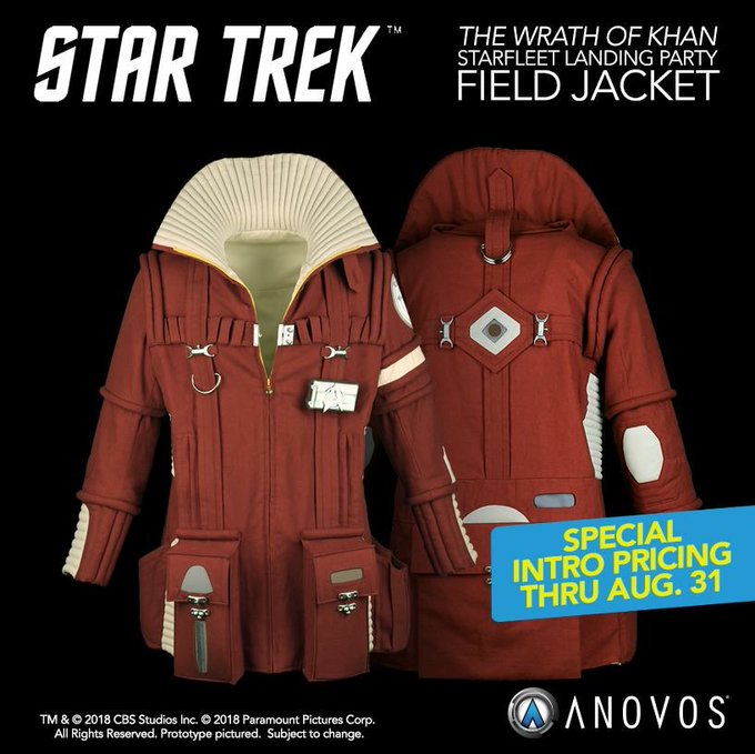 The elaborately collared and multi-pocket coat worn by Admiral Kirk in the film, is now available to order, with a long lead time; they’re not expected to ship until autumn 2019!
