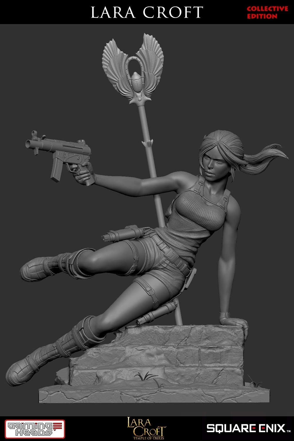 - The Tomb Raider™: Temple of Osiris – Lara Croft (Collective edition) statue is only available here at Gaming Heads and includes the staff of Osiris and an additional right arm holding the submachine gun. It also includes the parts that come with the Tomb Raider™: Temple of Osiris (regular edition) 1:6 scale statue, which is Lara’s right arm holding a flaming torch (yes, the torch can light up)* and the staff used by Horus.