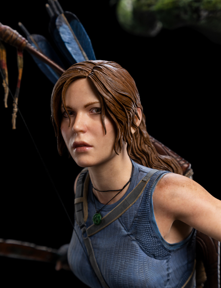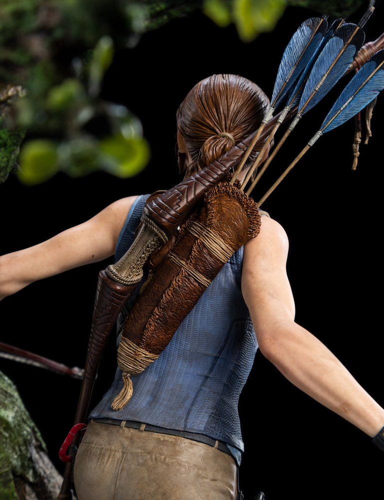 The imminent showdown with the jaguar catches Lara unaware. She is struck with the epiphany that she must become like the jaguar to stay alive. With stealth, Lara must stalk through the undergrowth, attack abruptly then disappear like the predator. Lara Croft’s arsenal increases her odds of survival. Seen here with her signature bow and arrow, twin climbing axes and pistol. Lara can strike from afar or up close and personal with the weapons at her disposal. And yet, the jungle is unforgiving. This highly-detailed sculpt bears all the telltale signs of Lara’s battles: scarred cheek, muddied clothing and rusty machete.