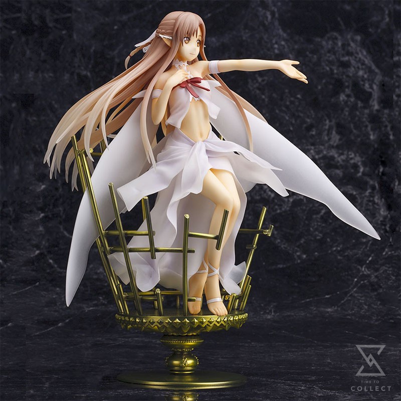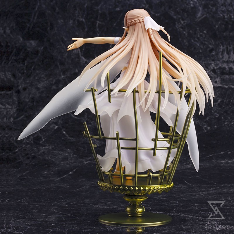 A Kotobukiya Japanese import! The next beautiful Ani*Statue from Kotobukiya comes from Sword Art Online, a Japanese light novel series by Reki Kawahara with illustrations by Abec that’s been adapted into manga, anime, and a video game. Returning in a new form with a woodland themed alter ego to match her friend Leafa is the main female protagonist Asuna -Fairy Dance-! The Knights of the Blood Oath clan sub-leader seems to float gracefully in a beautiful golden base, just lightly touching it with the tips of her toes. The elfin girl wears a diaphanous white dress that reveals her midriff and long legs, while its long back elements float in the breeze along with her long hair. Asuna touches one hand to her chest while she reaches out toward you, all the while piercing you with her light brown eyes and shy smile! Every part of her evokes a feeling of softness and beauty from the flowing lines of her clothing to her cute pointed ears. Sculpted by Shou Kojima, Asuna -Fairy Dance- is over 8 ½ inches tall (1/8 scale) as she floats inside her broken cage-like display base. Asuna fans will definitely need to add this version to their collections, and she’s the perfect companion to the previously released Leafa -Fairy Dance- Ani*Statue!
