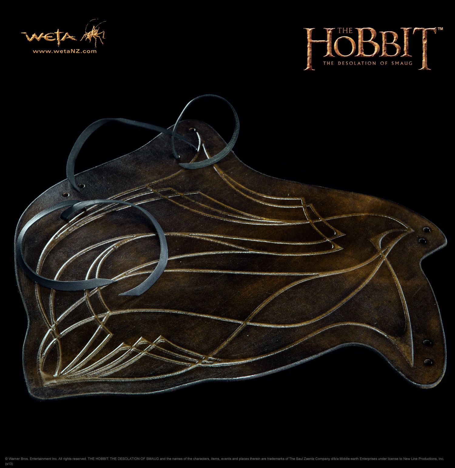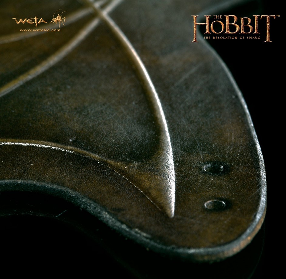 On Weta’s vambrace, closely modelled on the ones worn by Legolas in The Hobbit movies, an elven vine motif is embossed on rag dyed cowhide. It has been distressed and hand polished to create the mottled greenish brown hues and textures of the woodland realm under the canopies of Mirkwood. This is a hand made natural product with unique colour and texture variations, made in Wellington, New Zealand. A perfect accessory for an elven costume, for reenactment purposes or for budding archers, these vambraces are very tactile, beautiful to look at and have that genuine leather smell. Weta’s vambrace was created by the same talented artists and craftsmen who created leatherwork for the 3Foot7 art department on The Hobbit movies.
