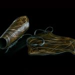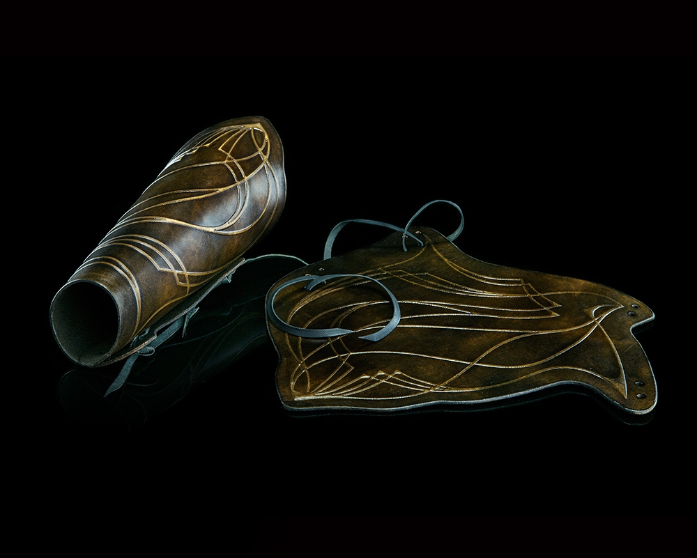 Lithe and agile, the silvan elf prince Legolas Greenleaf wore little in the way of protection except a pair of vambraces made from thick, strong leather. Offering scant defense against club or sword, the vambraces offer just enough protection to keep his forearms shielded from bow strings and knife cuts and allow Legolas to continue fighting in his inimitably dynamic style.