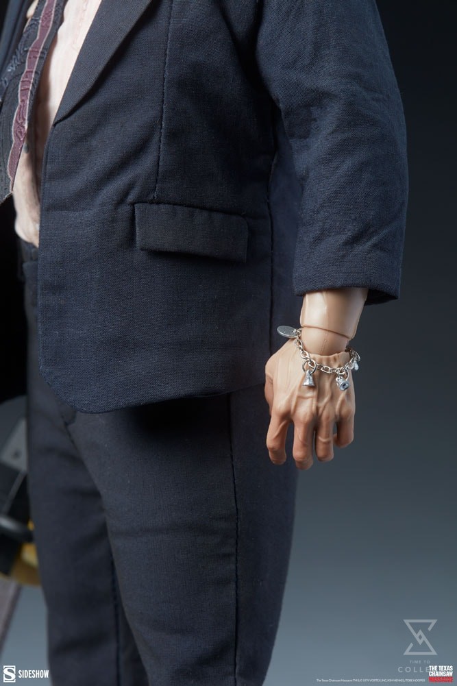 The Leatherface Deluxe Sixth Scale Figure includes a number of accessories and alternate costume elements to change up his southern style. Swap to the “old lady” mask portrait and distressed fabric apron to recreate even more scenes surrounding the sickening dinner climax of the film. The figure features a padded fabric undersuit to fill out the silhouette and includes Bubba’s tools of the trade for the family meat business- a chainsaw, an antler-handle knife, and a mallet. The killer cannibal comes with eight hands, including a pair of fists, a pair of grip hands, a pair of open hands, and a pair of posed gesture hands for interacting with his accessories, finishing the look with a charm bracelet for his wrist.
