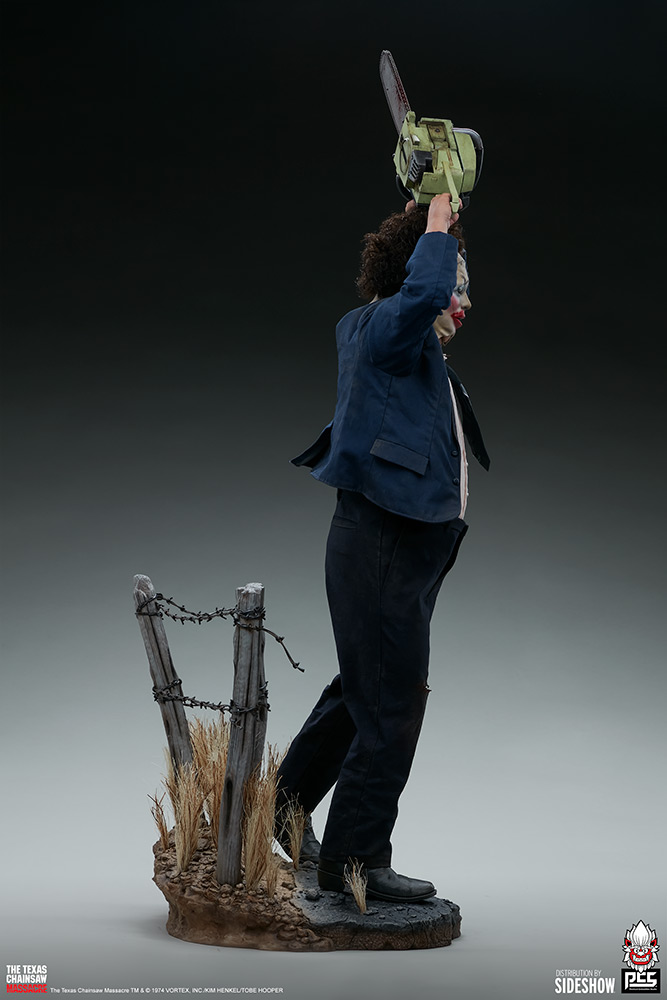 Inspired by the pulse-pounding finale of the film The Texas Chainsaw Massacre (1974), the Leatherface: Pretty Woman Mask Statue captures the acquired tastes and terrifying strength of this killer cannibal. The statue measures 33” tall and 17.5” wide as Leatherface revs his chainsaw above his head in a bloodthirsty frenzy, standing on the Texas roadside as the sun drops over the horizon. Rickety posts and dried grasses set the iconic scene of a harsh and unforgiving highway as his prey escapes the reach of his weapon — just barely.