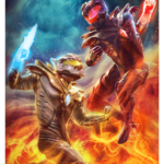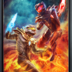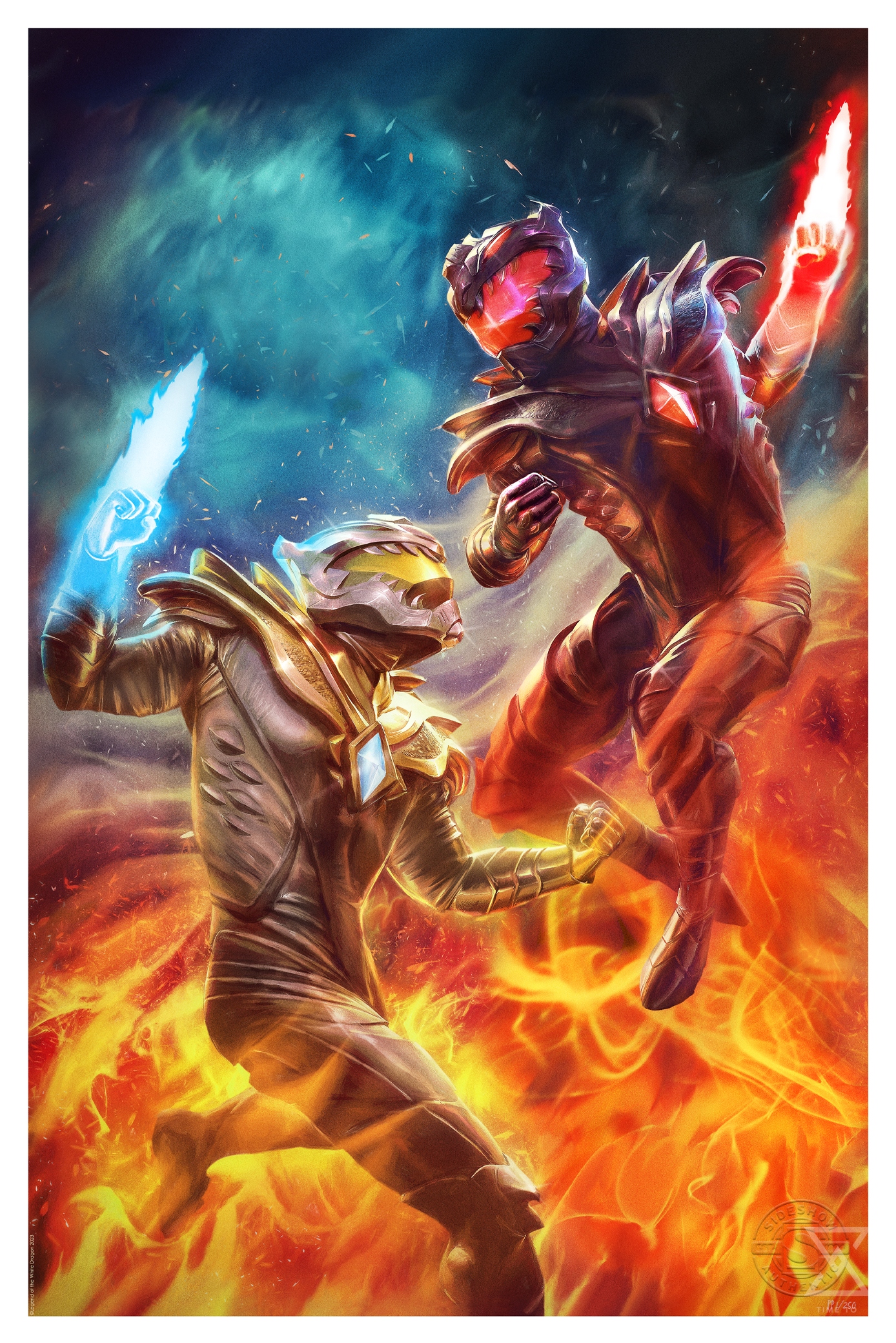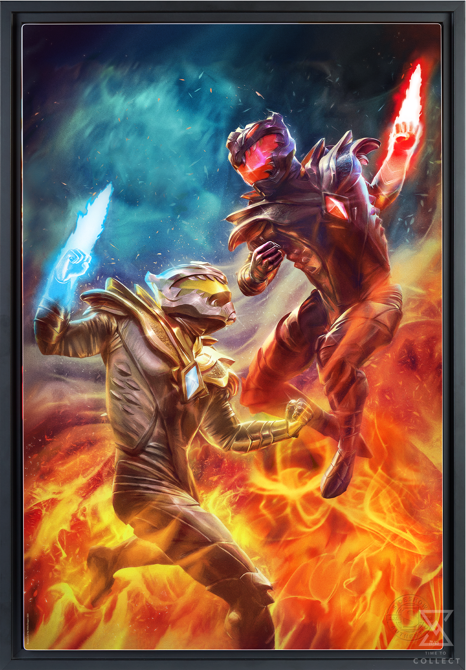 Witness the clash of dual dragons as hero Erik Reed, AKA the White Dragon, goes head to head with villain Jai Katua, AKA Dragon Prime. Both empowered by halves of the White Dragon crystal, they are at odds in a high-stakes battle of revenge and redemption. Swirling orange flames and mystic blue energy create a contrast on the canvas as these two foes prepare to strike, fated by the superhuman abilities they share. Legend of the White Dragon features the last on-screen performance of late actor Jason David Frank (Erik Reed), famous for bringing the original Green and White Power Ranger to life. A passion project for Frank and director Aaron Schoenke (Jai Katua), the film serves as an important part of his legacy as well as a love letter to martial arts films in general.