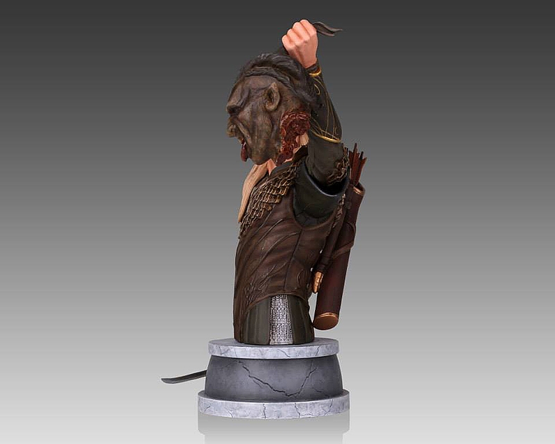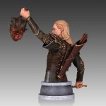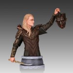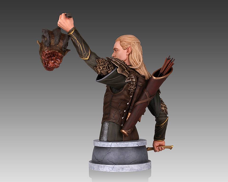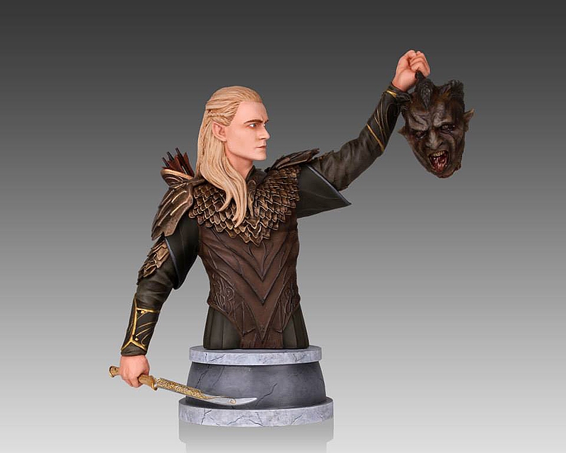 Based on his appearance in The Hobbit: The Desolation of Smaug, the dramatic Legolas Mini Bust depicts the feared Elven warrior holding up the severed head of a vanquished orc as a battle trophy. Digitally sculpted by the master artisans at Gentle Giant Ltd. using photo reference direct from the set of the film, the Legolas Mini Bust boasts an unparalleled level of detail and fidelity – from the pattern and style of his armor to the engravings on his sword, no detail has been overlooked. Cold cast in high-quality polystone, each limited edition, hand-painted piece comes individually numbered and includes a matching certificate of authenticity making them quite…precious… to collectors, indeed.