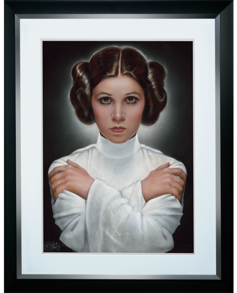LOVINGLY RENDERED IN THE INDELIBLE LIKENESS OF CARRIE FISHER AS PRINCESS LEIA, THIS PORTRAIT CAPTURES THE REGAL AND REBELLIOUS FACE OF HOPE THAT HAS INSPIRED AN ENTIRE GALAXY OF STAR WARS FANS ACROSS GENERATIONS. SEEN HERE IN HER STUNNING WHITE GOWN AND ICONIC HAIR BUNS FROM STAR WARS: A NEW HOPE, PRINCESS LEIA REPRESENTS THE STRENGTH, GRACE, AND DETERMINATION FOR WHICH SHE IS KNOWN.