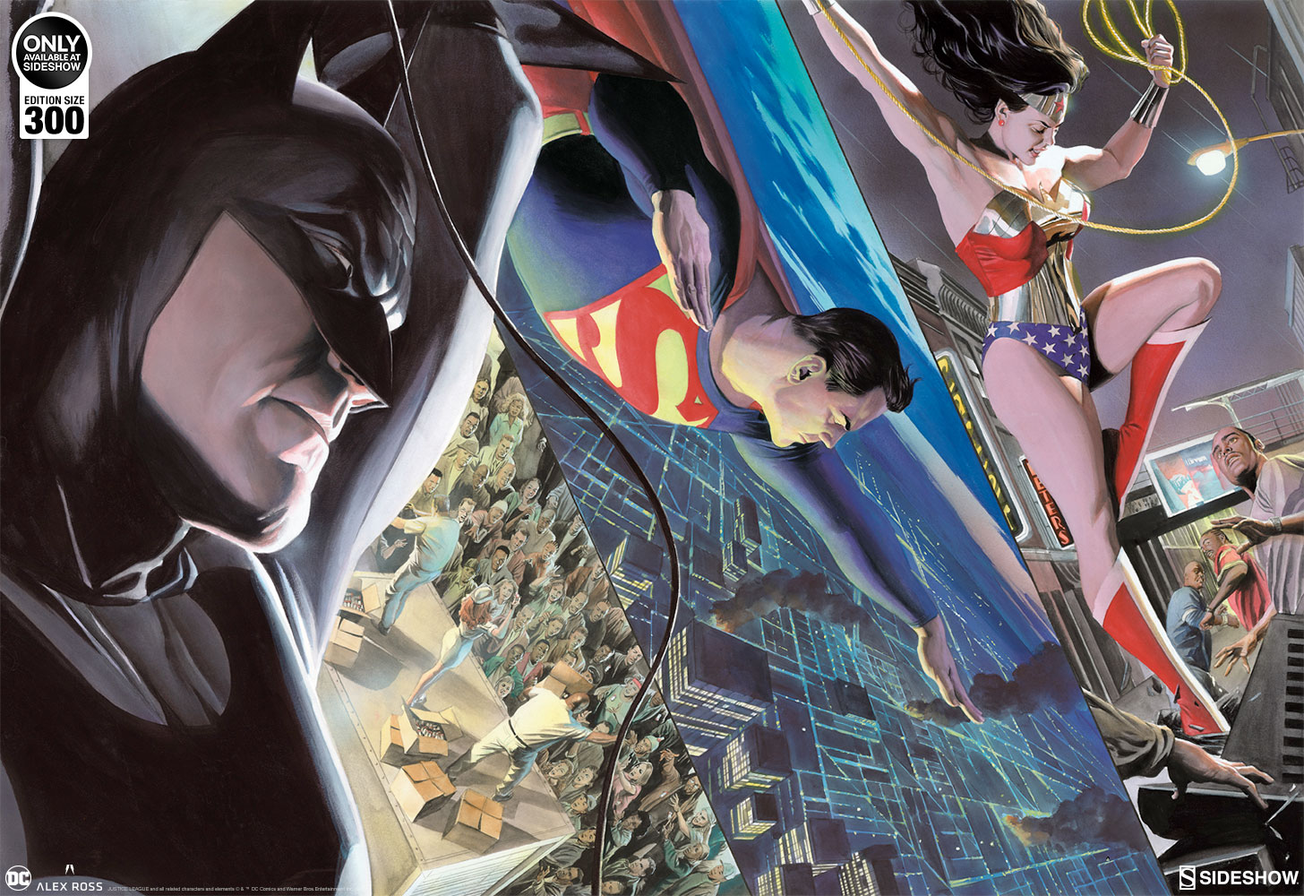 DEPICTING THE FAMED DC COMICS ‘TRINITY’ OF BATMAN, SUPERMAN, AND WONDER WOMAN, THIS DYNAMIC ART PRINT COMPILES THREE ILLUSTRATIONS ORIGINALLY CREATED BY ALEX ROSS FOR THE INTERIOR OF THE COMIC LIBERTY AND JUSTICE. THE PRINT IS LIMITED TO AN EDITION SIZE OF 300 PIECES, AND FEATURES THE THREE HEROES SOARING INTO ACTION OVER CROWDS, THROUGH CITIES, AND ON THE STREETS TO BRING LIBERTY AND JUSTICE TO CITIZENS IN NEED.