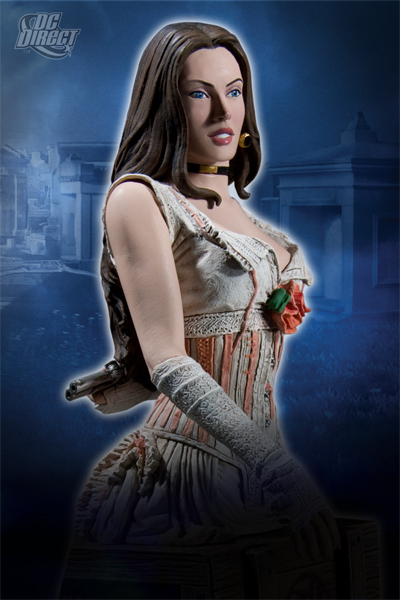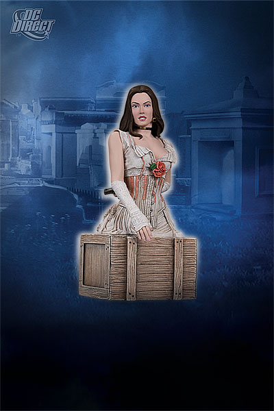 This hand-painted, cold-cast porcelain bust depicts working girl Leila as she appears in the upcoming movie, posed atop a crate of dynamite.