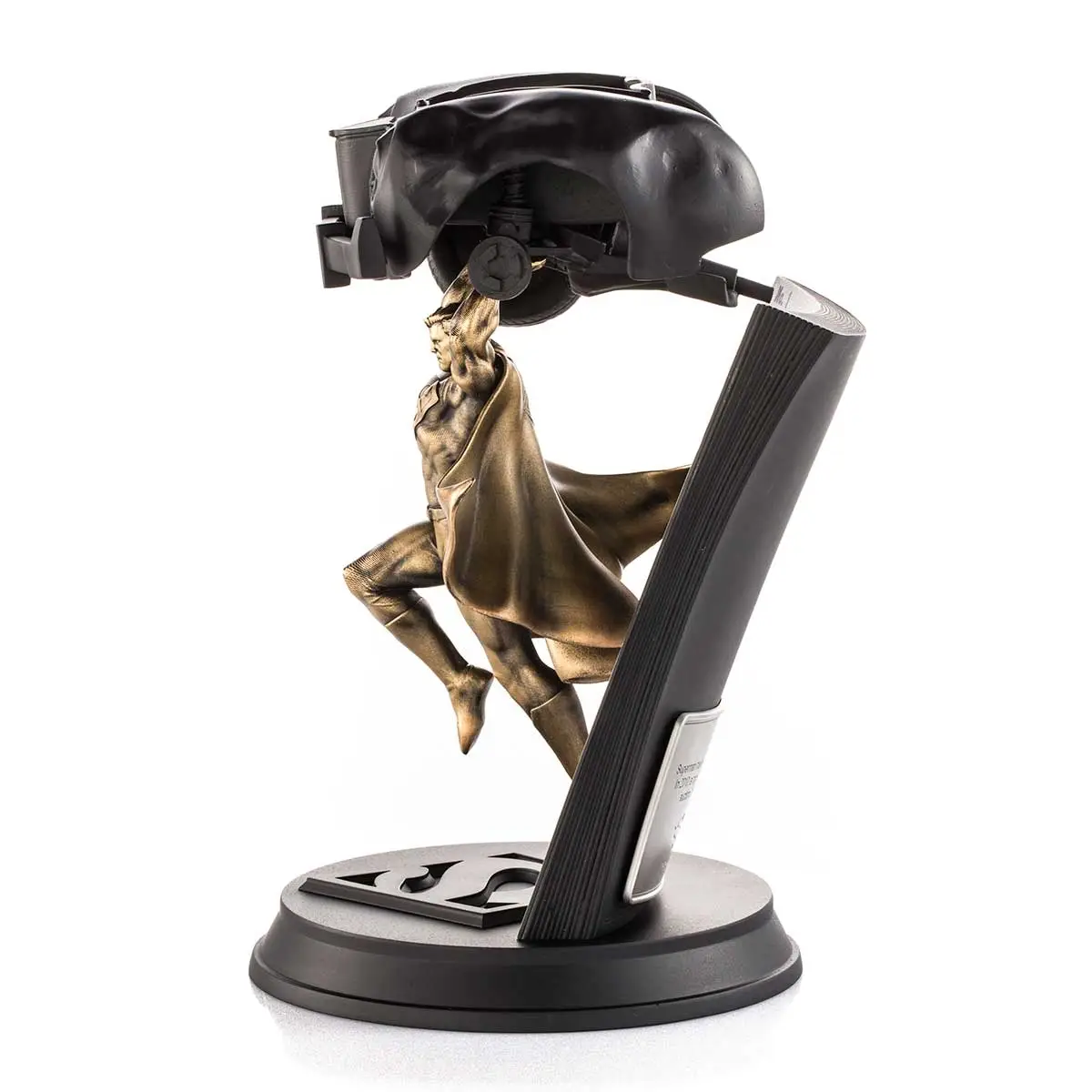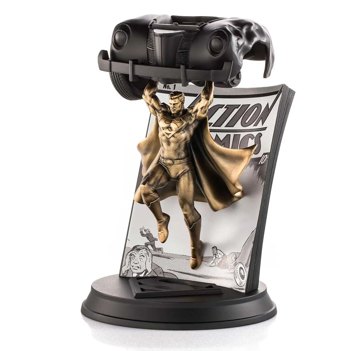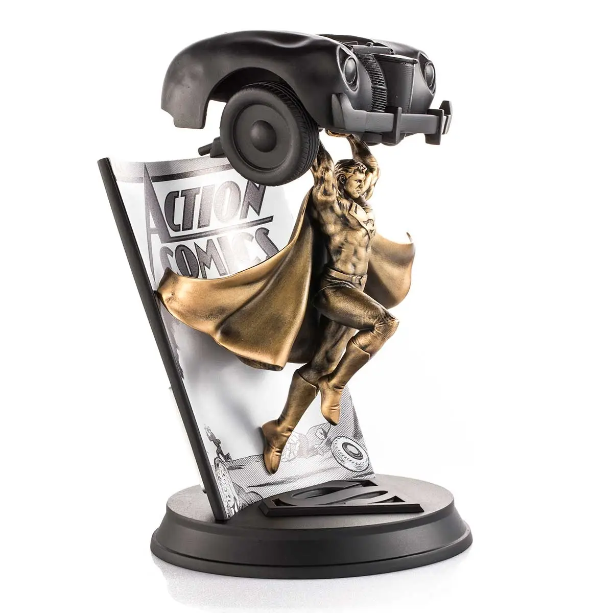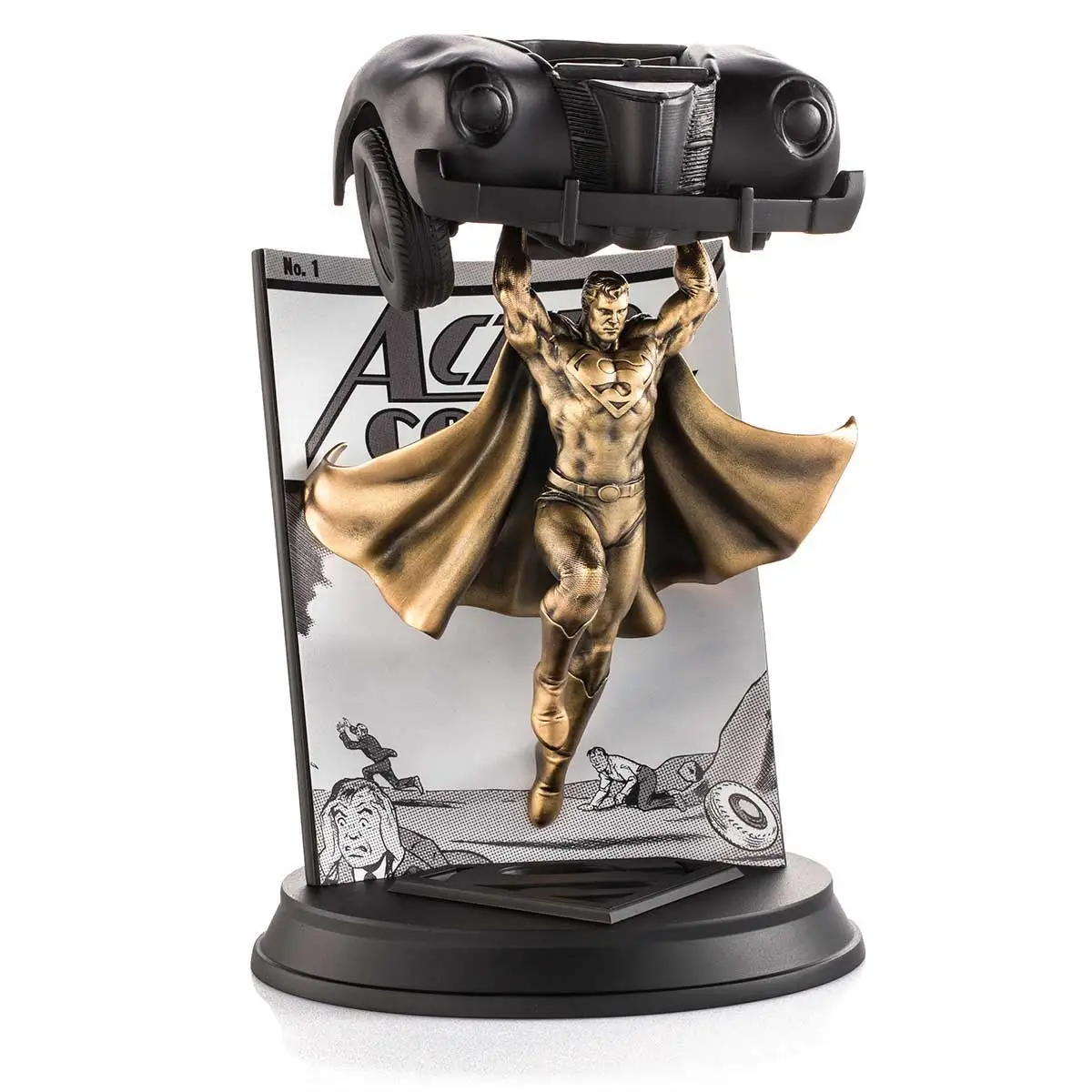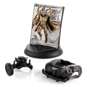 Illustrator Alan Quah and sculptor Mufizal Mokhtar’s sensitive homage reimagines Jerry Siegel and Joe Shuster’s Superman with spectacular effect, with 24K gilt in a retro-style patina embellishing the cast pewter Superman. The hoodlums’ crumpled vehicle, with its removable bodywork, is reproduced in bonded porcelain. A sepia-toned facsimile of the original comic enhances the period feel.