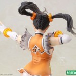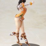 Knowing she’s fast enough for any challenge, young Xiaoyu smiles as she stands in a martial arts pose that shows her determination as well as her beauty. The fighter leans forward slightly with her back arched, legs crossed with her front foot pointed to accent the smooth lines of her leg. Twisting to her left Xiaoyu stretches out her left arm with her fingers spread while her right arm is held back in preparation. Meanwhile, there is a tremendous amount of movement in her pose with the fluttering of her twin ponytails, the feathers at her collar, the hem of her short Chinese dress, and the straps of her matching shoes! The bold orange, white, and black of Xiaoyu’s costume really stand out, as does her captivating Bishoujo inspired face with its look of cute concentration.