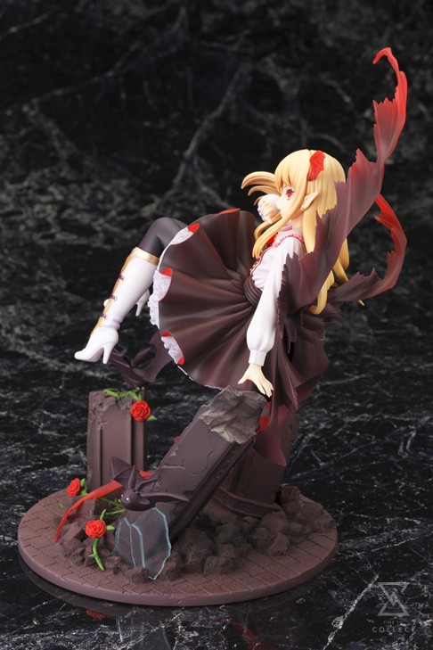 Vania reclines in mid-air, her knees together and feet spread apart while she holds one delicate hand up to her adorable face. The girl wears an incredible outfit consisting of a white blouse with trim and ties, a huge black and red skirt over a white ruffled one, and black stockings with tall white boots. There is a fantastic degree of details on the Little Queen’s clothing and on the girl herself like her pointed ears, bat wing-like horns, and her beautiful blonde hair flowing around her. Sculpted by Yuzo, Vania is over 7 inches tall (1/8 scale) as she hovers over broken pillars, shards of glass, roses, and flying bats on her impressive georama display base. Little Queen Vania will be the star of your collection, and she’s the perfect companion to previously released Rage of Bahamut statues Dark Angel Olivia and Spinaria!