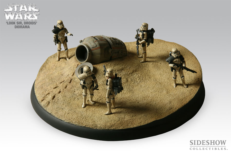 Sideshow Collectibles and Lucasfilm are proud to bring you this exciting, limited entry in the Star Wars Diorama series. The diorama captures the critical moment when the sandtroopers realize that they are hunting for two droids that escaped detection aboard the escape pod. Each piece is cast in high quality polystone, hand-finished, and hand-painted to exacting standards. The ‘Look, Sir, Droids’ Diorama is complete with a unique individualized edition number on the bottom side of the base. Don’t miss this chance to expand your Star Wars collection!