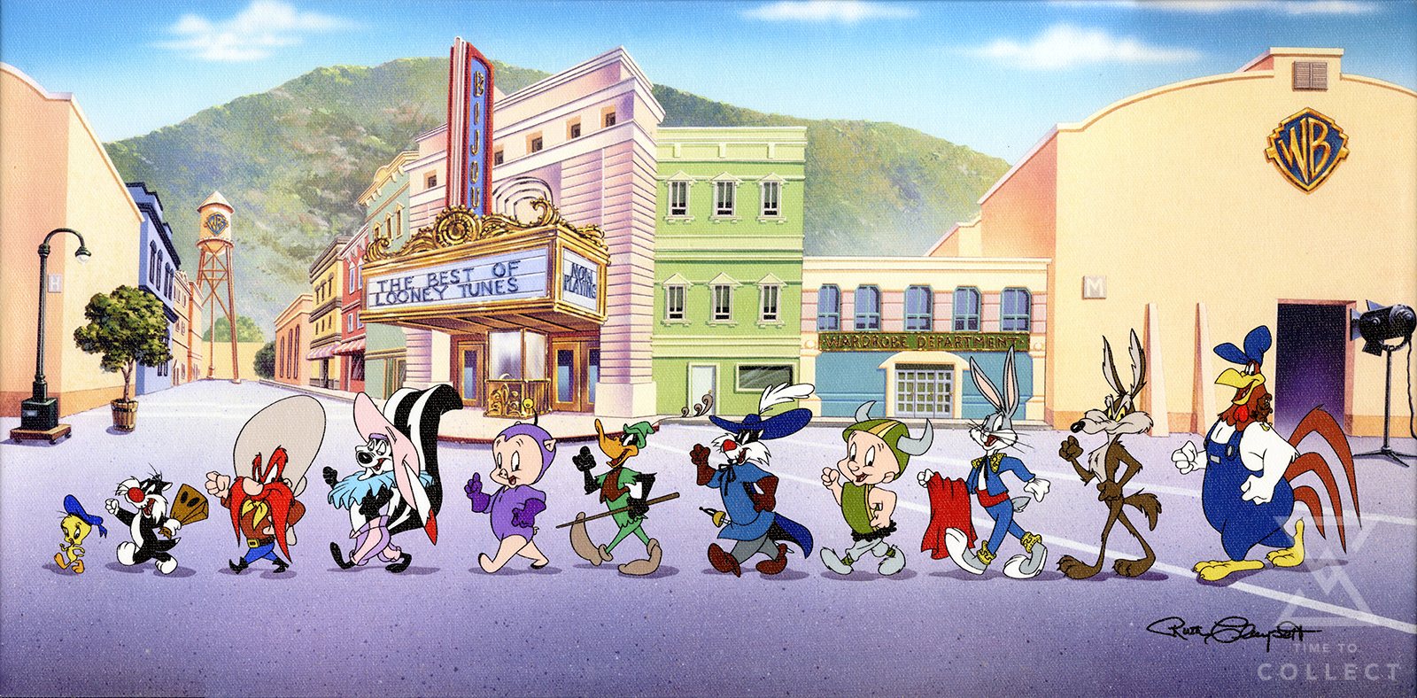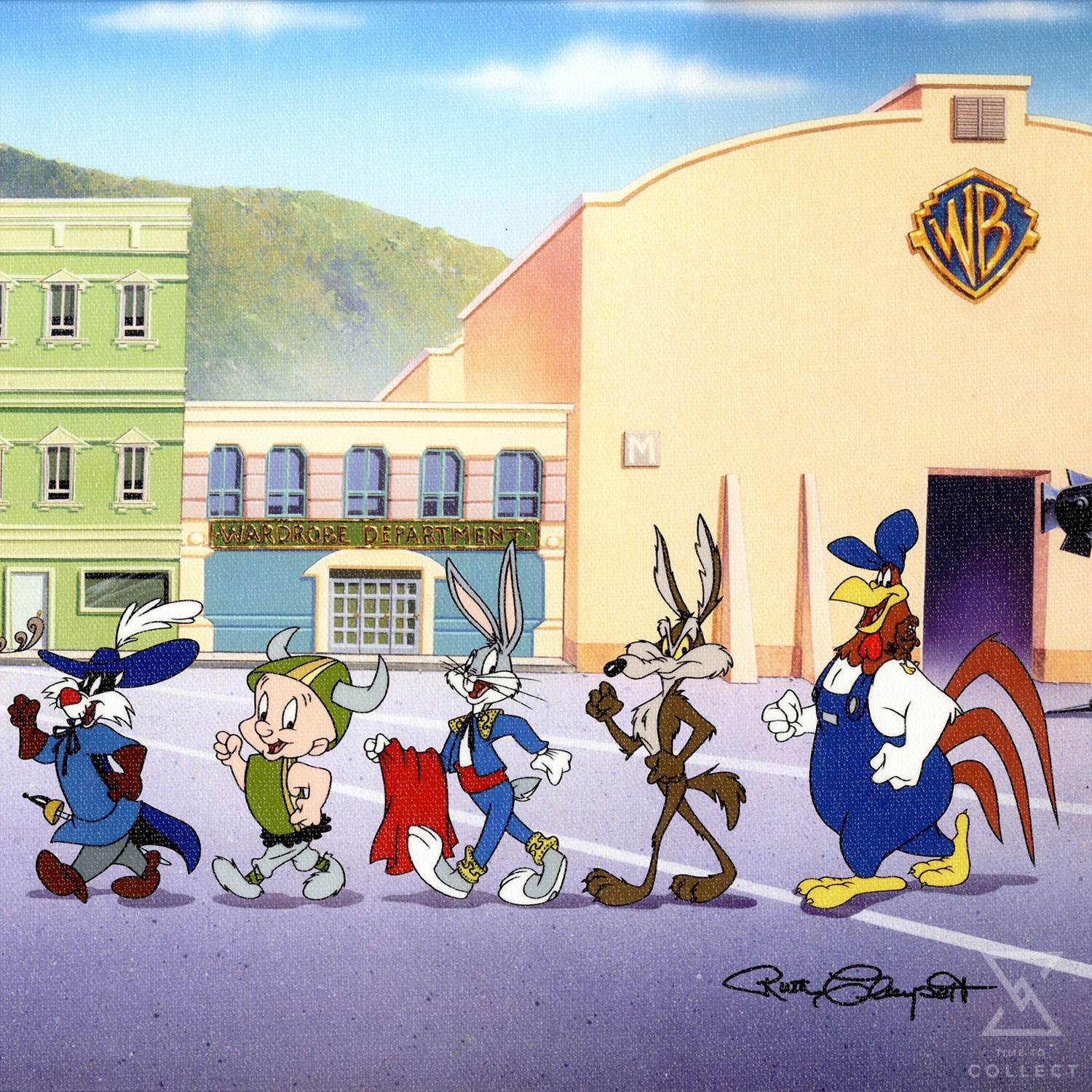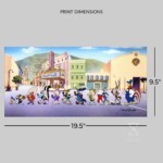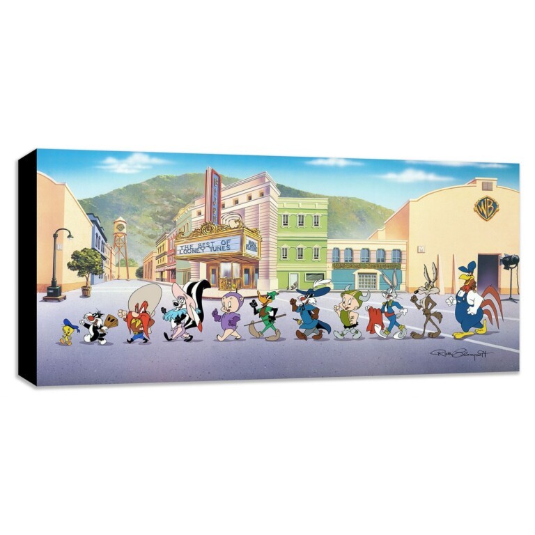 It’s just another day of filming for those lovable characters on the Warner Bros “backlot”. Many of the costumes shown represent the characters from their finest film roles. Designed and developed in the studios of Warner Bros, this Mighty Mini Canvas print shows 12 key Warner Bros. characters – Tweety, Sylvester J. Pussycat Jr., Yosemite Sam, Pepe Le Pew, Porky Pig, Daffy Duck, Sylvester, Elmer Fudd, Bugs Bunny, Wile E Coyote, and last but not least Foghorn Leghorn – marching to their own tune. From the sound stage they go, past the Wardrobe Dept., and on their way to work.