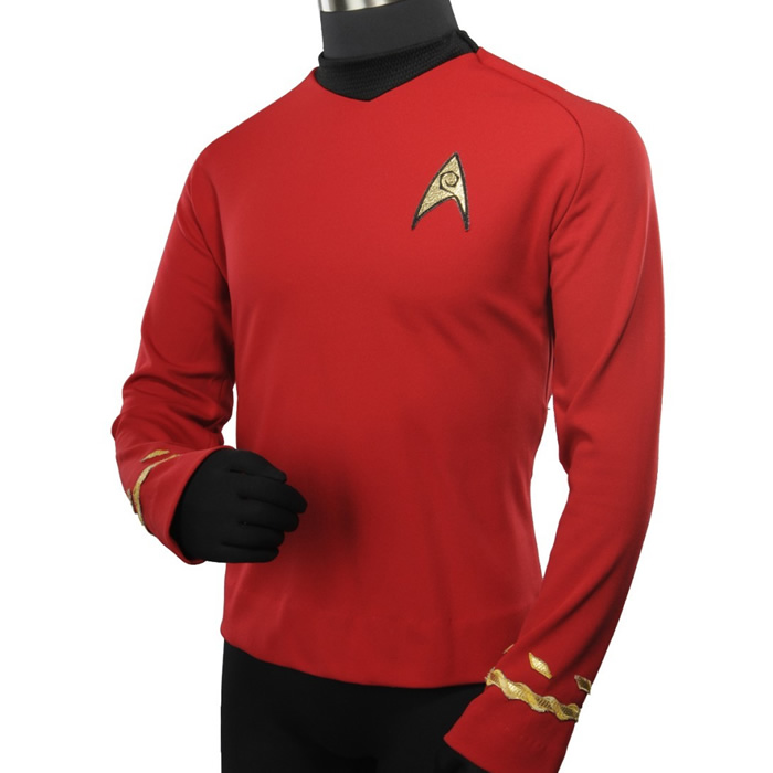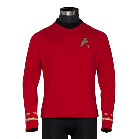 Scotty is finally here to save the day! The Season Three edition of Star Trek TOS Engineering/Security Division Red Tunic is now available. Using the exact double-knit fabric, and patterns drawn from a screen-used hero Spock uniform, this top will meet every fan expectation even to the most critical eye, right down to the braid that was given the seal of approval by Greg Jein himself. Tunic features the Services Division Delta Shield Enterprise patch with one brai and dash set to denote Scotty’s rank of Lt. Commander.