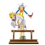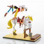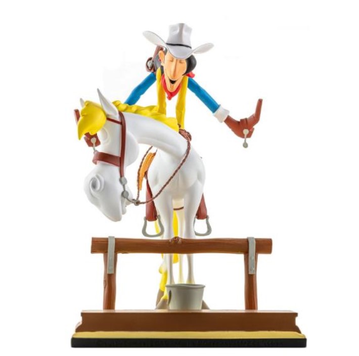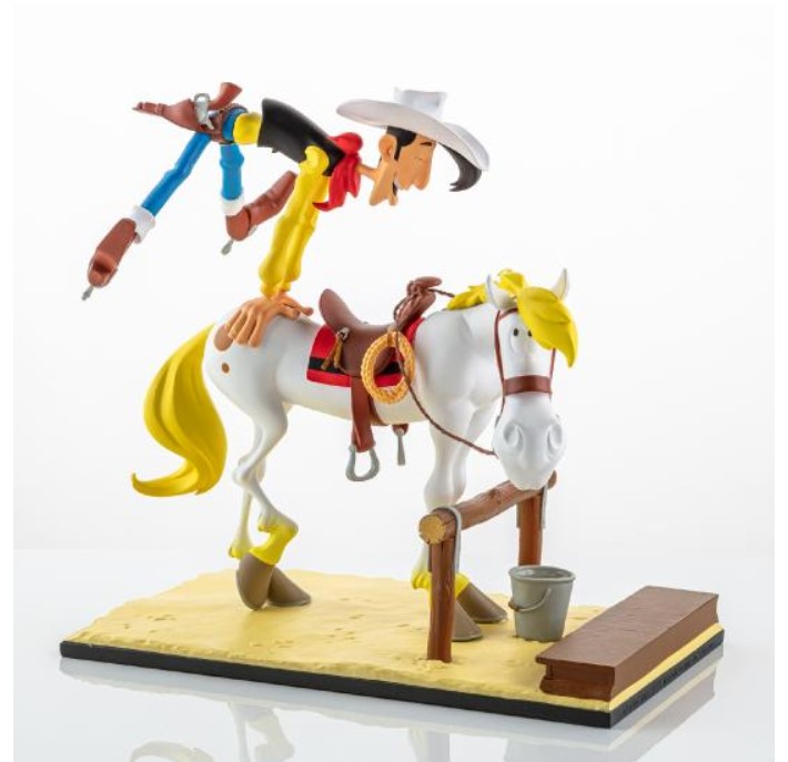 Cette statuette de Lucky Luke et Jolly Jumper inaugure la nouvelle collection Bang Bang! consacrée aux personnages créés par Morris & Goscinny. Chaque création mettra en scène plusieurs personnages des aventures de Lucky Luke avec des petits éléments de décor. L’échelle retenue permet d’imaginer une série de dioramas de taille raisonnable, tout en conservant une qualité optimale pour les détails des figurines. Un seul credo : rester fidèle à l’art de Morris! Pour cette première statuette, il était impensable de ne pas représenter les 2 héros apparus en 1946 dans l’Almanach Spirou. Ce gag où l’on voit Lucky Luke monter en selle énergiquement (ce qui énerve bien souvent Jolly Jumper !) est récurrent. On le retrouve dans de nombreuses aventures de Lucky Luke (Les Cousins Dalton en 1958, A l’ombre des Derricks en 1962, la ville fantôme en 1965, etc…) avec des variantes: les 2 mains sur la croupe ou sur la tête et parfois avec une seule main comme sur le célebre dessin publicitaire pour l’album Canyon Apache (1971). C’est donc dans l’ensemble de ces dessins que nous avons cherché l’inspiration pour composer cette saynète.