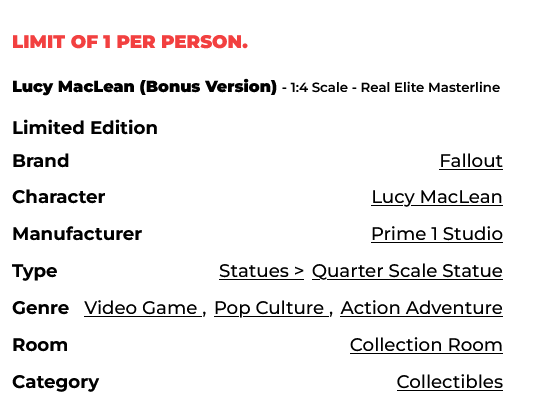 Set 200 years after nuclear war, Fallout weaves together the stories of three protagonists. From the drama series that carries over the original game’s sharp satirical spirit, Lucy MacLean is brought to life in the Real Elite Masterline.