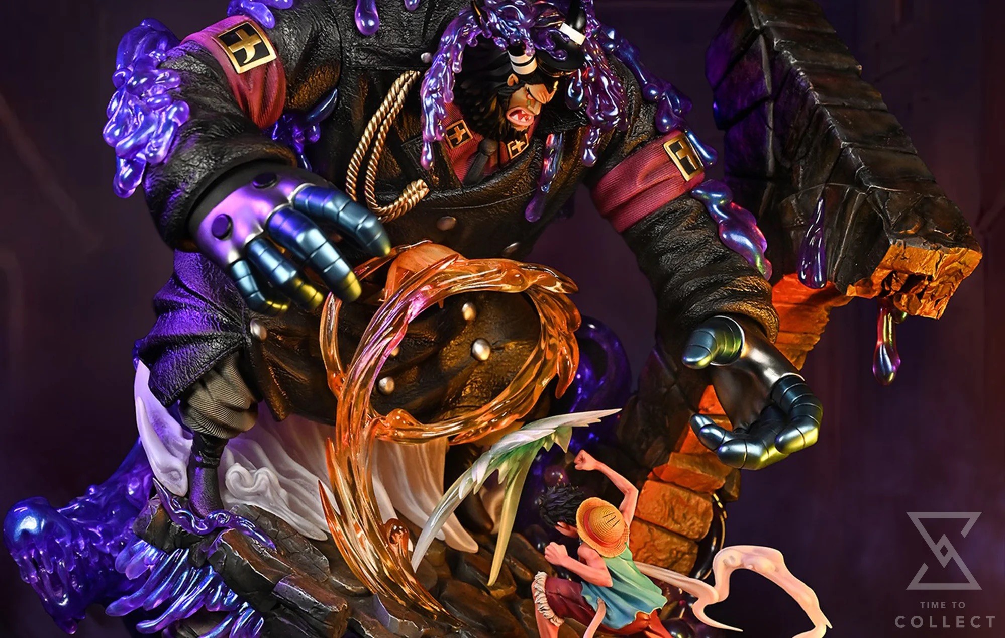Exceptional design of the SFX parts. Our goal is to preserve as many of the characters’ features as possible and emphasize their originality in texture in the design of the main body of the statue. Magellan’s venom special effect part is different from most of the pure transparent parts currently on the market. In our production process, we have added pearlescent paint technology, which not only enhances light reflection but also adds a sense of thickening and heaviness to the product. It seems as if the dark purple venom that is stained on the wall and that covers Magellan’s body will drop at any second and will really corrode you when it touches you. In this battle scene, Luffy’s muscle lines and the airwaves designed with a gradient effect significantly contribute to its dynamic representation.